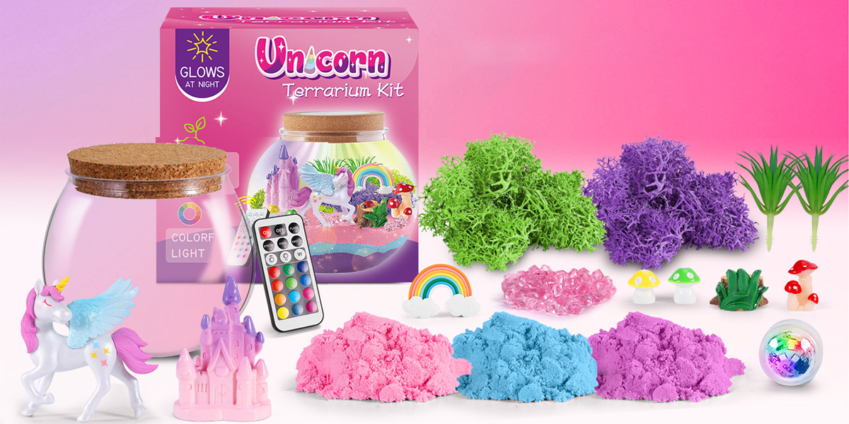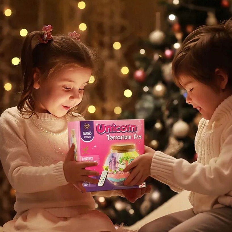 Пробудите воображение вашего ребенка и позвольте ему создать уникальный террариум с мотивом единорога, который после сборки светится ярким светодиодным светом!