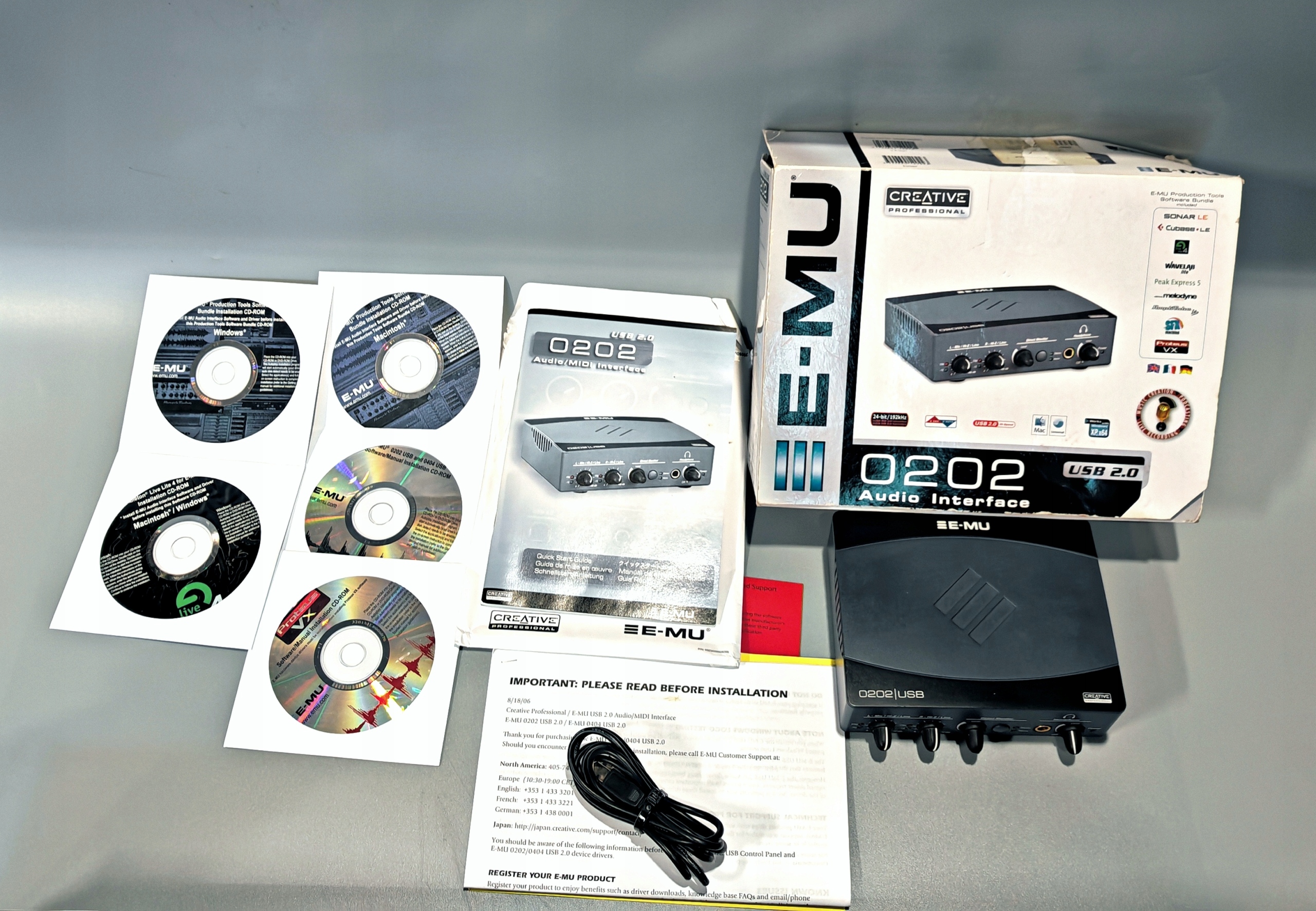 Я должен продать звуковую карту Super Audio/Creative USB E-Mi 0202 в богатом наборе кабелей, 5 компакт-дисков с программным обеспечением и упаковкой магазина Audio Creative USB E-Mi 0202 USB MIDI два канала CD Sound Card Card Box