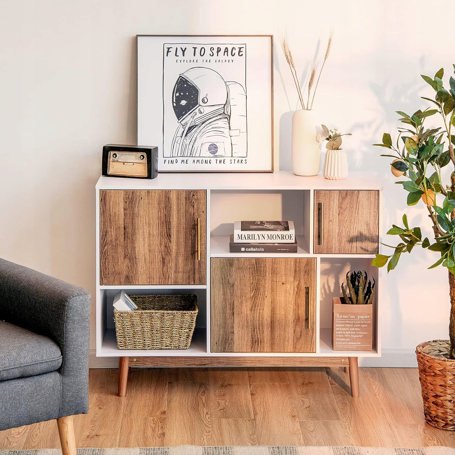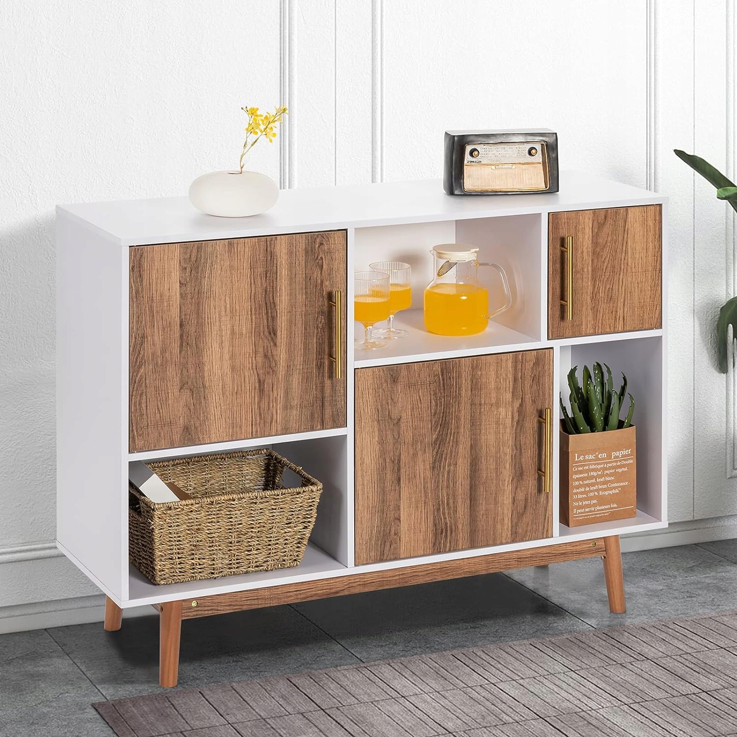 - Универсальный и универсальный — этот боковой шкаф можно использовать как комод, шкаф в гостиной, акцентный шкаф, кухонный шкаф. и т. д. Подходит для многих вариантов, например, столовой, спальни и офиса.