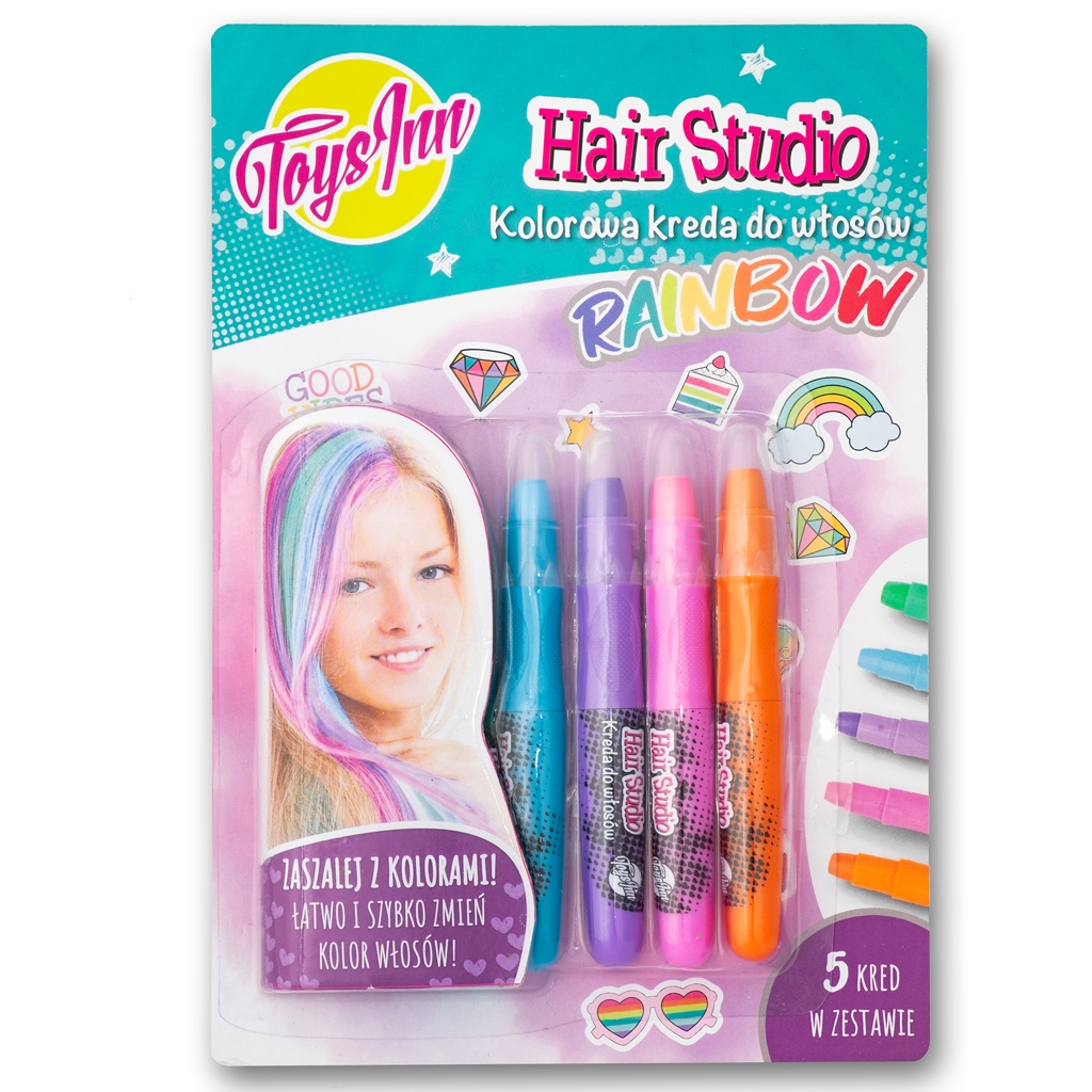 Студия для волос Rainbow - это красочный меан для волос. Сходи с ума с цветами! Измените цвет волос легко и быстро. Набор содержит пять мелок в цветах: зеленый, синий, фиолетовый, розовый и оранжевый. Чтобы удалить цвета из ваших волос, просто вымойте их шампунем.