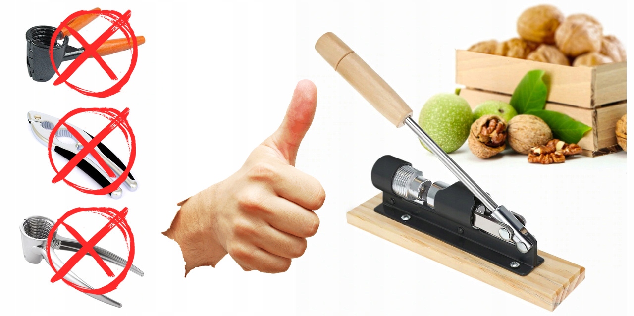 Щелкунчик из нержавеющей стали, прикреплен к деревянной основе. Уникальная конструкция позволяет надежно удерживать гайку. Обеспечивает большую прочность и позволяет получать более чистые и крупные куски мякоти.