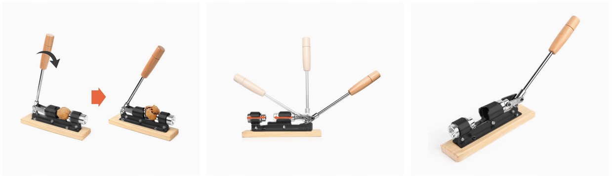 Простое управление с помощью рычага с деревянной ручкой. Чтобы снять скорлупу, просто сложите рычаг, и механизм дробления расколет скорлупу, оставив большую гайку.