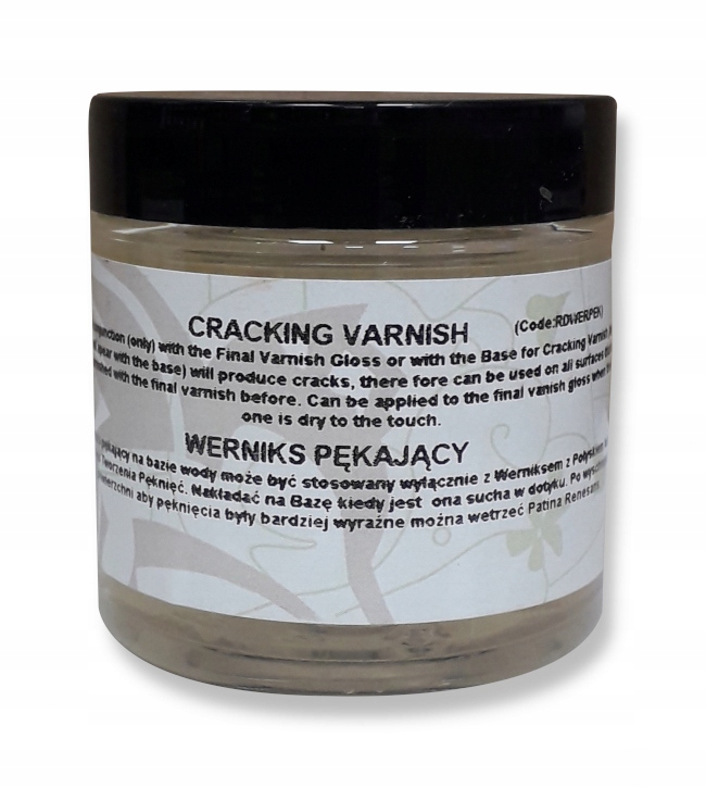 Лак для растрескивания на водной основе можно использовать только с лаком состаривания «Ренесанс» или глянцевым лаком «Ренесанс». При нанесении на состаренный или глянцевый лак он вступает с ним в реакцию, создавая эффект растрескивания. Без объединения этих двух препаратов трещин не возникнет. Лак для растрескивания можно наносить поверх состаренного лака примерно через 20 минут (трещины тогда будут больше), но не раньше, чем через 1 час – чем дольше сохнет грунтовочный лак (стареющий или глянцевый), тем меньше будут трещины. Лак позволяет получить трещины, например, по всему рисунку, и позволяет добиться иного эффекта, чем однокомпонентные средства, вызывающие трещины в акриловых красках.
