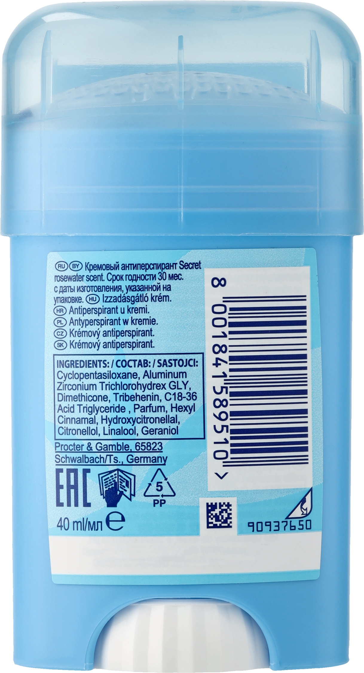 Сливочный стик-антиперспирант Secret Rosewater имеет сбалансированный pH и увлажняющие вещества, которые делают кожу приятно гладкой и свежей на 48 часов. Ничто не помешает вам чувствовать себя свежим весь день с кремообразным дезодорантом-антиперспирантом с ароматом розовой воды. Пот, влага и неприятный запах не имеют шансов противостоять предусмотренной защите в течение 48 часов. Секретный кремовый дезодорант-стик-антиперспирант обеспечивает ощущение сухости, защищает от неприятных запахов и придает свежесть. Секретный кремовый дезодорант и стик-антиперспирант сохраняет сухость, защищает от неприятных запахов и придает свежесть