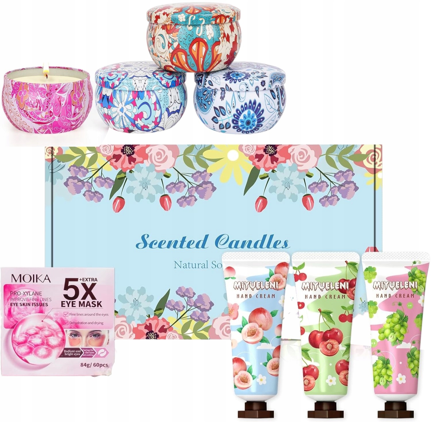 ⭐️ Подарочный набор – 3 мини-крема для рук + 4 ароматические свечи в стакане + 60 патчей для глаз⭐️