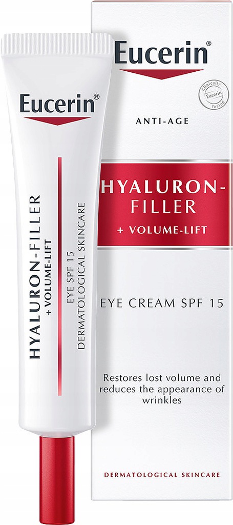 Eucerin Hyaluron-Filler + Volume-Lift Eye Cream SPF15 – ухаживающий крем для глаз, подходящий для всех типов кожи, включая чувствительную. Крем для глаз разработан для женщин 40+ для предотвращения признаков старения кожи. Крем оказывает подтягивающее действие и придает коже заметно более гладкий вид.