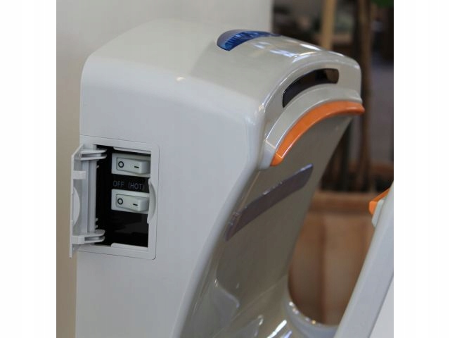 Руки можно сушить сильной струей теплого или холодного воздуха, поскольку сушилка имеет переключатель нагрева. В режиме ЭКО после выключения нагревателя энергопотребление снижается на 50% и составляет 700 Вт (выходная мощность 1400 Вт).