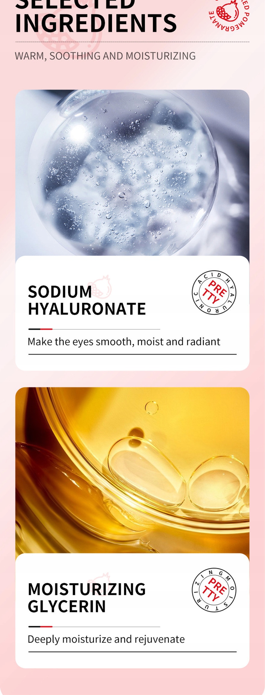 ① свежий экстракт граната, полный антиоксидантных молекул, которые могут эффективно блокировать меланин и осветлять кожу. кожа вокруг глаз;