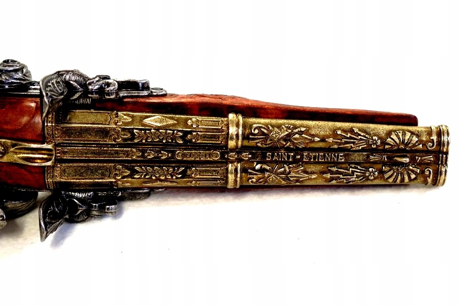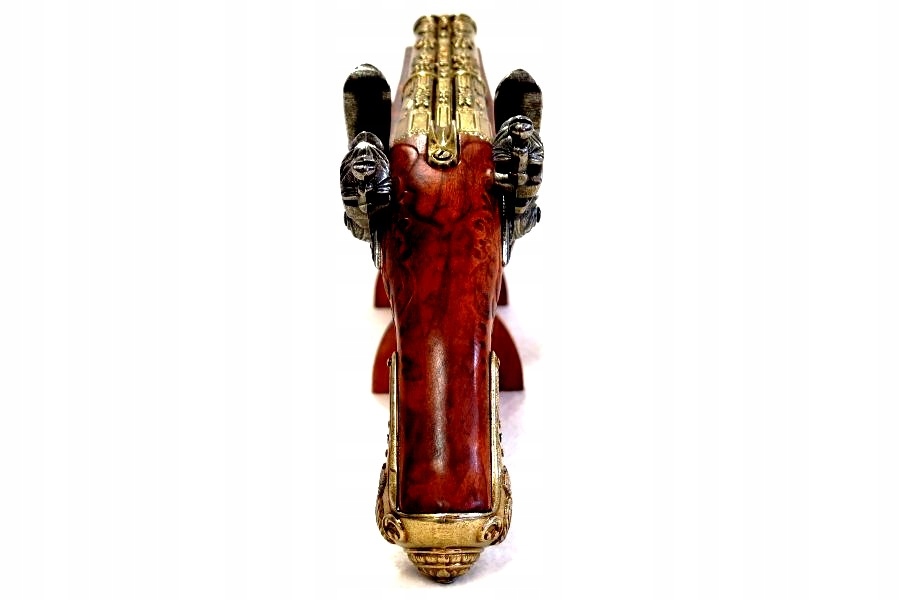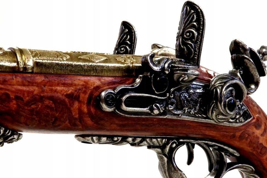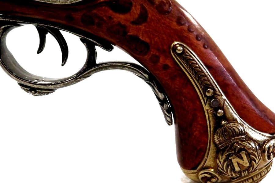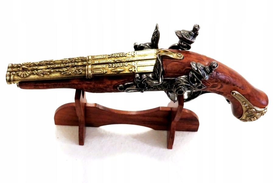 Самый богатый вариант кремневых пистолетов в Дениксе. предложение. «Випасиор» имеет два ствола, два курка и два спусковых крючка. Курки могут взводиться независимо, спусковые крючки расположены один за другим, каждый из них сбрасывает свой курок. Используемая древесина, вероятно, сосна, художественно украшенная резьбой, затем пропитанная морилкой и покрытая полуглянцевым лаком с видимой текстурой. Металлические части реплики изготовлены из ZnAl, сплава цинка и алюминия, окрашены в два цвета: сталь и латунь с состаренной патиной. Ложа орудия усилена металлическим «кулером», с видимыми надписями с обеих сторон: буквой «Н» в венке с короной наверху. Элегантно оформленные замки позволяют вести сухой выстрел и исключить возможность перезарядки оружия. Механизм реплики не создает искру!