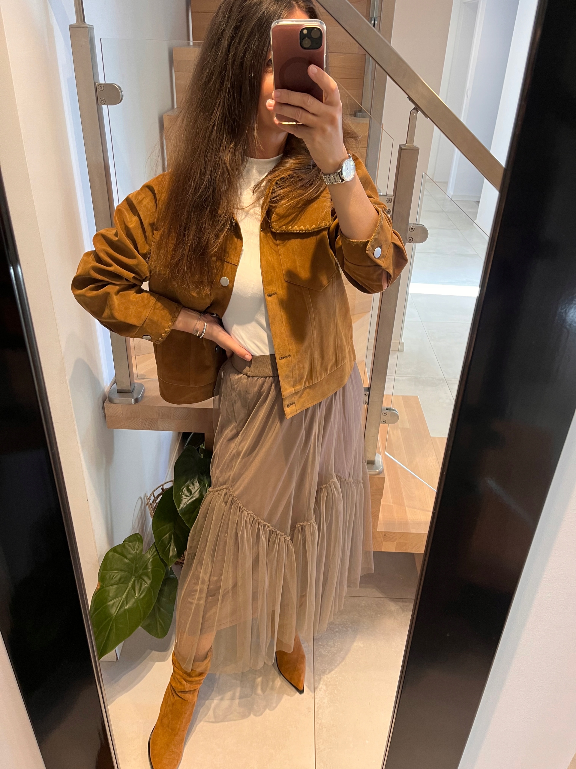 Отличная женственная юбка датского бренда крем из впечатляющей ткань из тюля, на светло -коричневой подкладке. Простой классический миди, половина теленка, с мягкой эластичной лентой на талии. Очень женственно, эффективно - идеально подходит для многих модных осенних комбинаций.