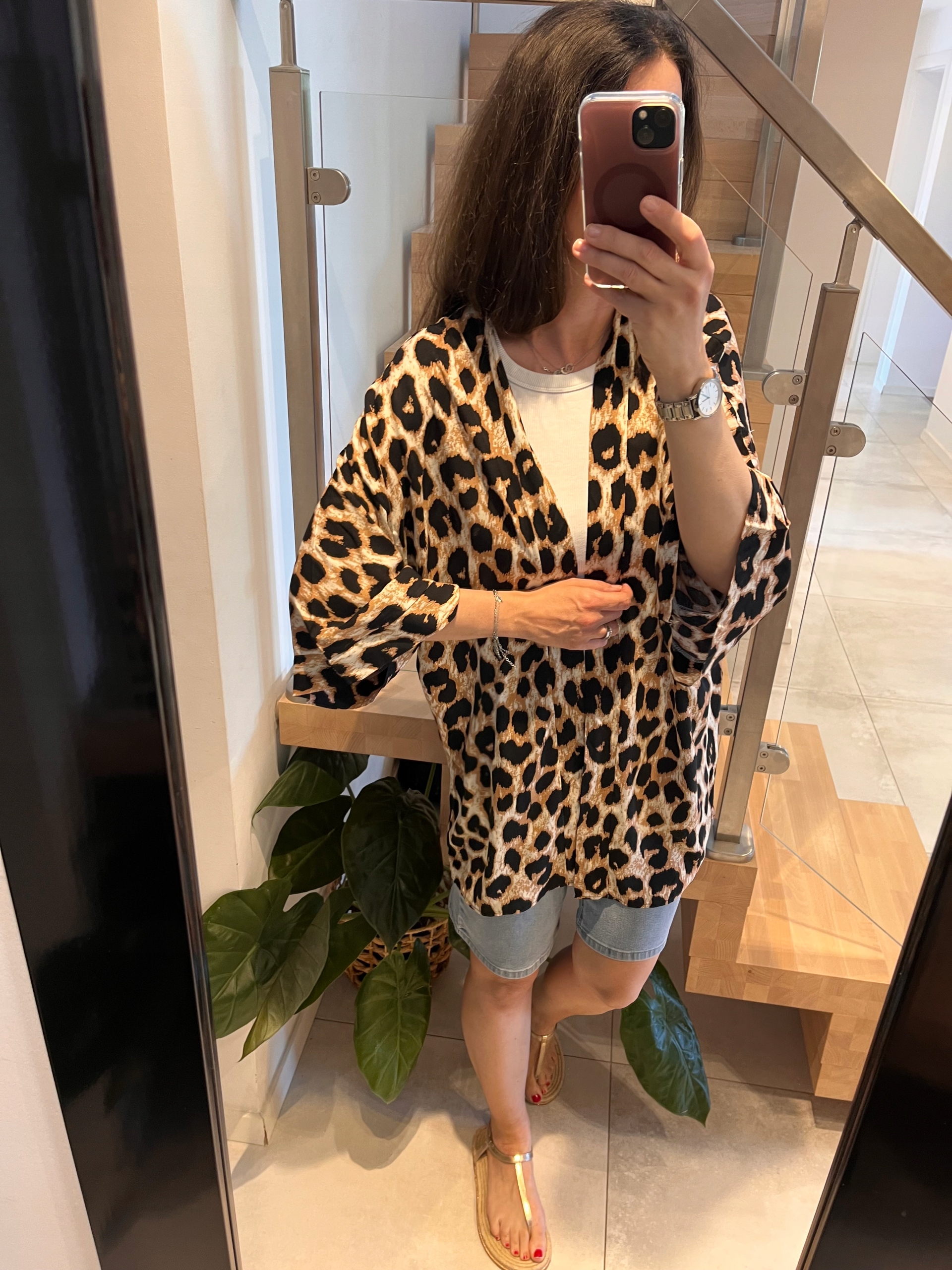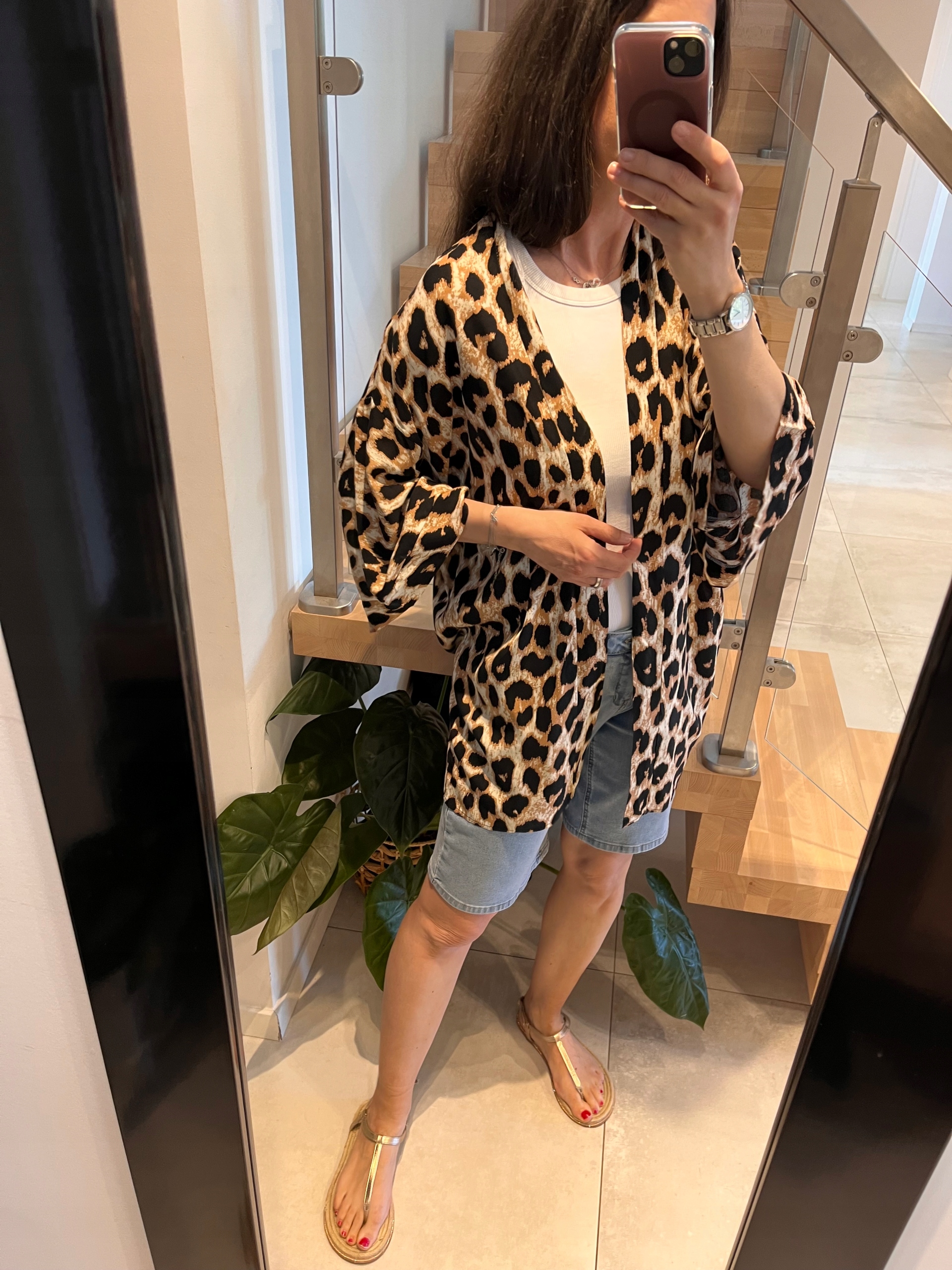 Кремовый кимоно в леопардовом печатном мысе в отпуске.