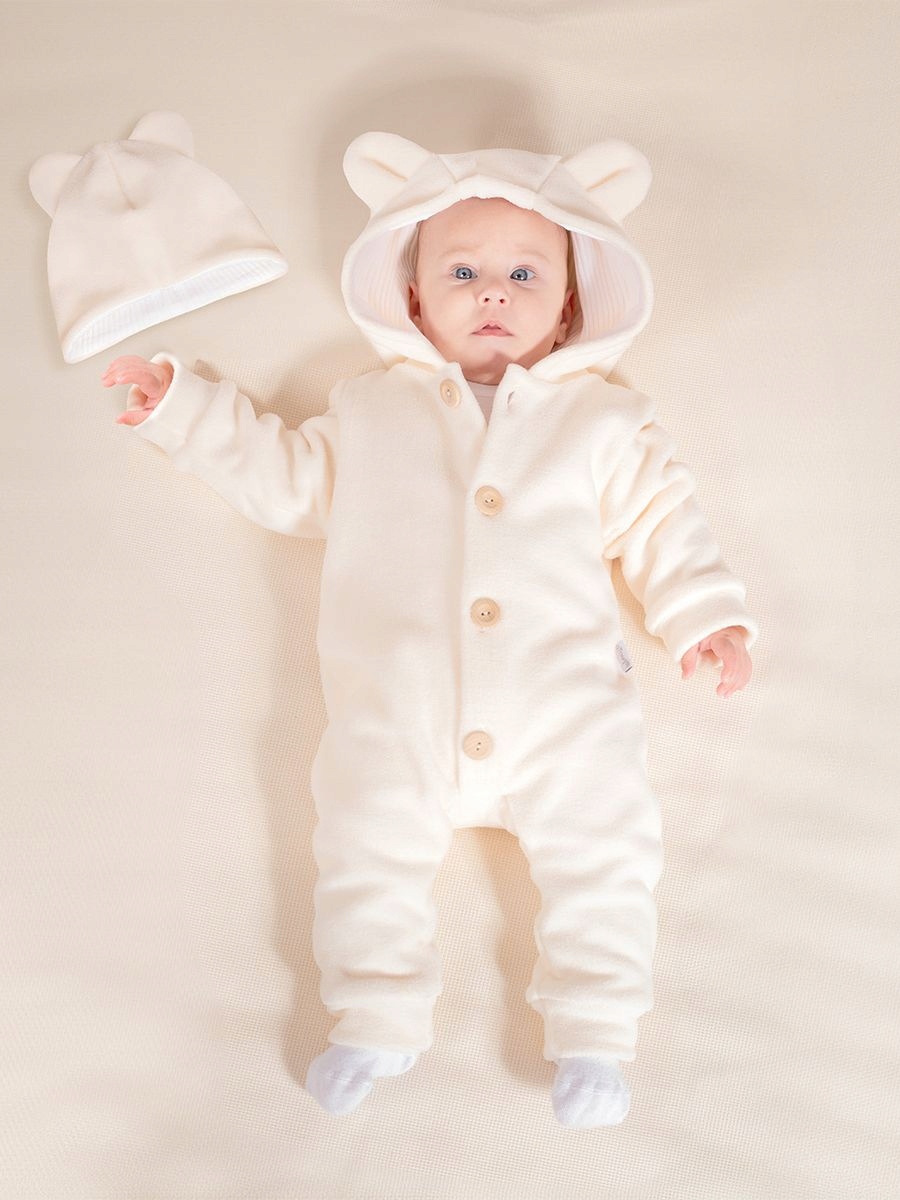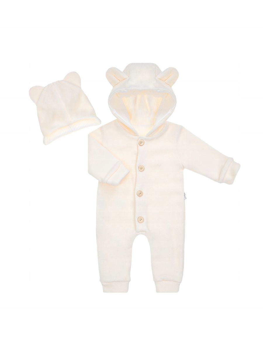 Сделано в Польше. Набор из двух предметов для девочек и мальчиков. Комплект состоит из мягкого комбинезона из флиса кремового цвета на подкладке в рубчик, также кремового цвета. Комбинезон застегивается на деревянные пуговицы, имеет капюшон с ушками. Шапка изготовлена из флиса кремового цвета, также имеет подкладку в полоску кремового цвета, имеет декоративные ушки.