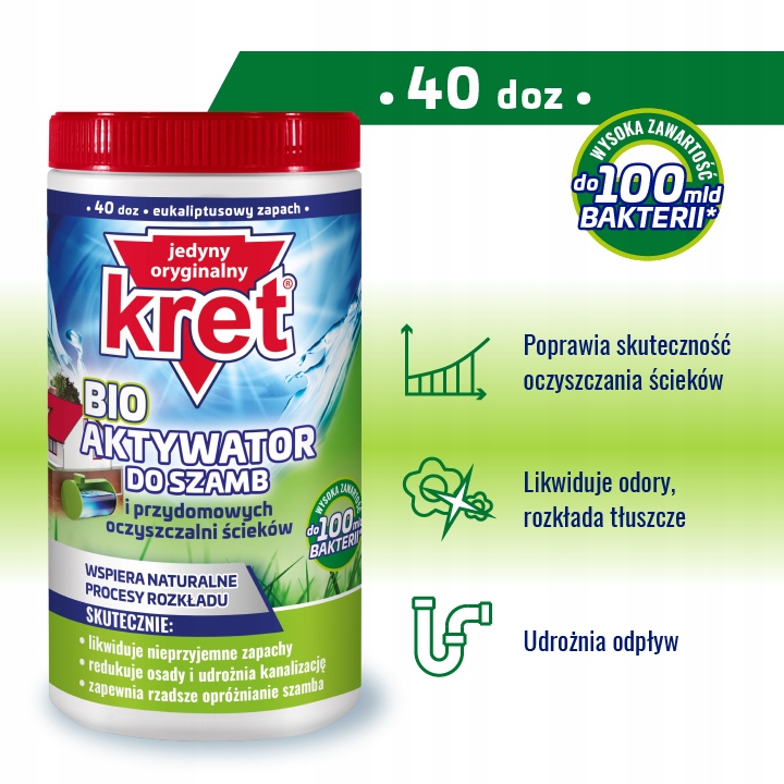 Kret BIO Активатор для септиков это современный и уникальный на польском рынке микробиологический препарат, состоящий из специально отобранных штаммов бактерий и ферментов, который: