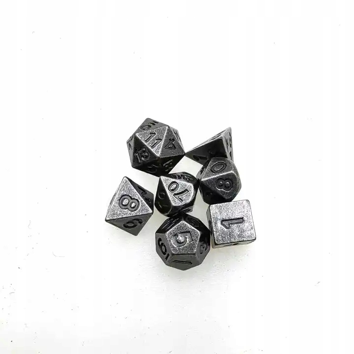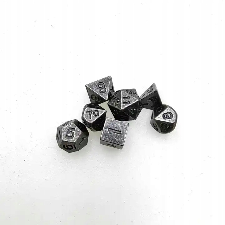 Набор, состоящий из 7 крошечных металлических кубиков для ролевых игр и металлического брелока для удобной транспортировки кубиков.