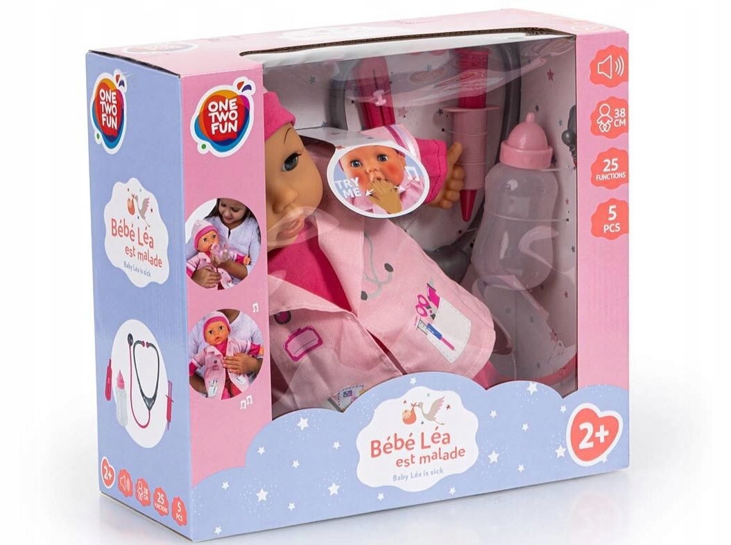 Леа — куколка ростом 38 см. Он закрывает глаза, чтобы заснуть, и имеет 25 функций. Позаботьтесь о ней, потому что она больна! Когда у нее жар, ее щеки светятся в течение 15 секунд. Сделайте ему инъекцию, чтобы он не блестел. Послушайте сердцебиение, применив стетоскоп. Когда вы даете ей бутылку, она издает сосательные звуки, а когда допивает, рыгает. В комплекте: кукла, термометр, стетоскоп, шприц, бутылочка с соской.