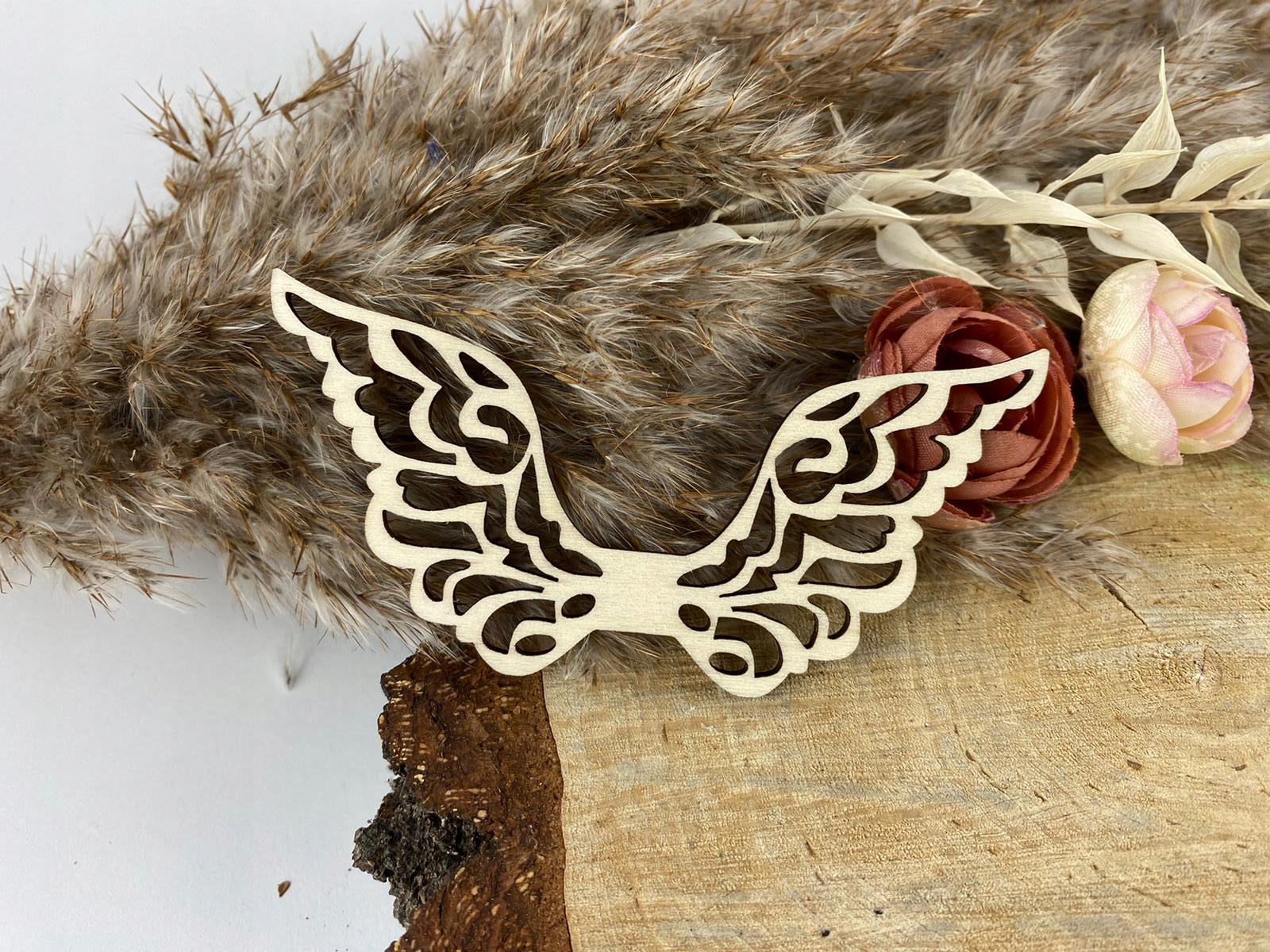 Крылья ангела изготовлены из натуральной фанеры толщиной 3 мм, что гарантирует долговечность и легкость. Их нежная структура и точное исполнение придают им элегантный и утонченный вид.