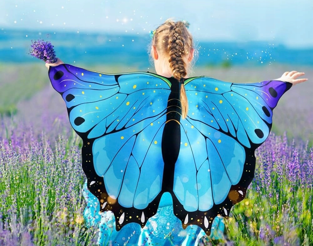 ✅ Крылья бабочки (плащ) : Большие, эффективные крылья в интенсивные оттенки синего и пурпурного , украшенные деликатными дизайнами, которые придают им реалистичный вид. Крылья связаны вокруг шеи , а имеют упругую эластичную на концах, которые можно положить на пальцы, что позволяет ребенку свободно растянуть крылья.
