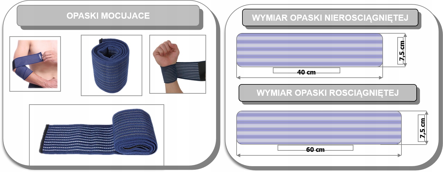 Закрепленные полосы, изготовленные из сильной эластичной резиновой резины, заканчивались типом застежки типа «репа» с длиной 40 см и в состоянии, растянувшееся около 60 см. Для людей с ожирением можно соединить полосы с липучкой.