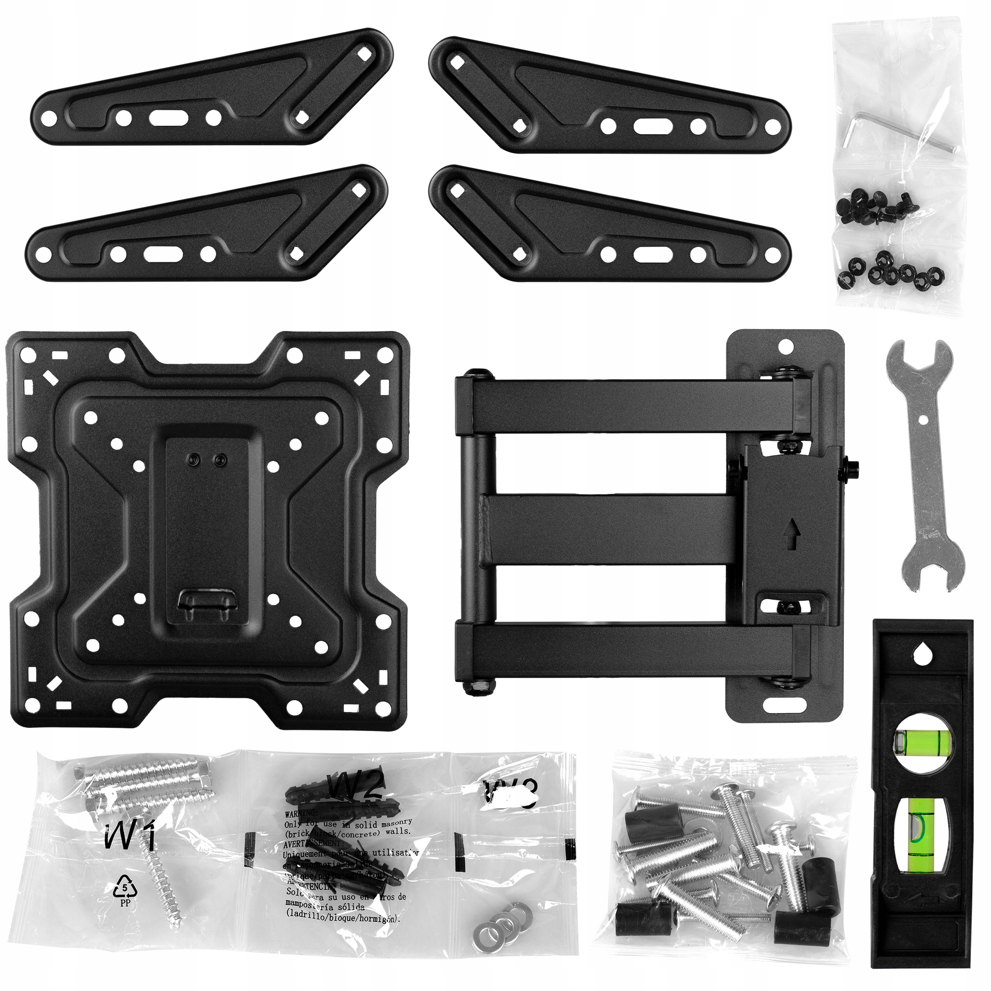 - В комплект входитуниверсальный набор шурупов для крепления телевизора, а также набор шурупов и дюбелей, уровень