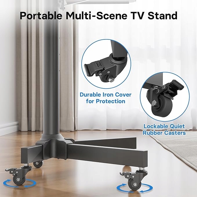 Перемещайтесь куда угодно. Эта складная подставка для телевизора, оснащенная четырьмя прочными колесами, позволяет легко перемещать тележку для телевизора из одного места в другое; Встроенный механизм блокировки позволяет при необходимости зафиксировать или переместить тележку для телевизора.