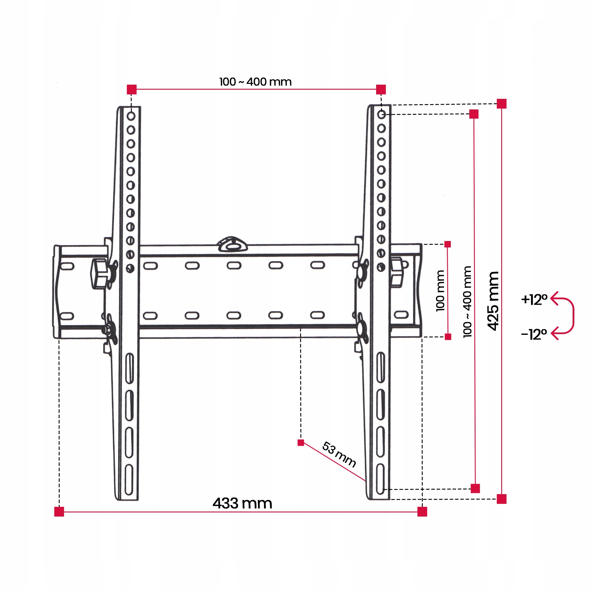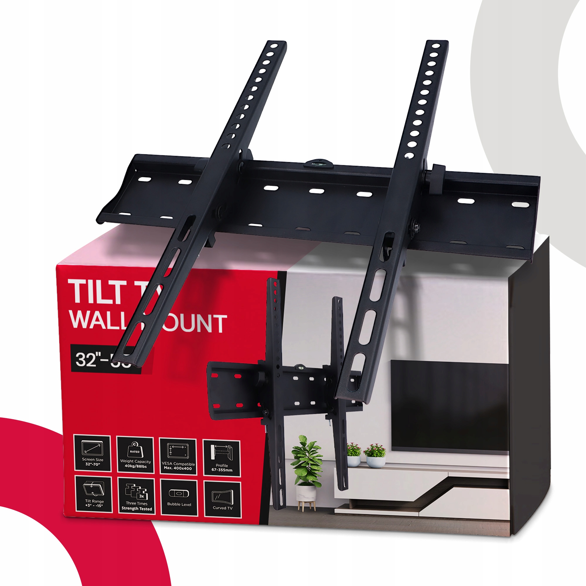 вешалка позволяет регулировать наклон - вверх и вниз от 12 ° до -12 ° . Благодаря этому вы можете легко настроить положение телевизора в удобное положение, независимо от того, расслабляетесь ли вы на диване или упражнениях перед телевизором.