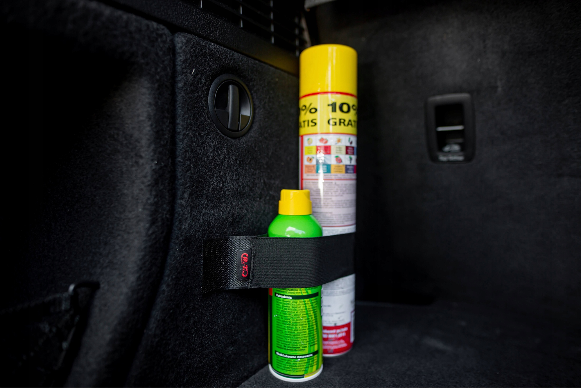 Ручки имеют прочную липучку, которая идеально прилегает к внутренней части багажника, коврик которого можно застегнуть на липучке. Эластичная манжета обеспечивает идеальное прилегание держателя к предметам, благодаря чему они прочно прилегают к ленте без возможности выскользнуть.