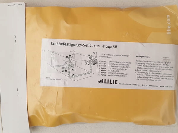 Монтажный комплект для резервуаров для воды или газа. Комплект позволяет установить бак под полом. Возможна предварительная сборка вне автомобиля. В комплект входят все необходимые детали. Идеально подходит для караванов и кемперов.