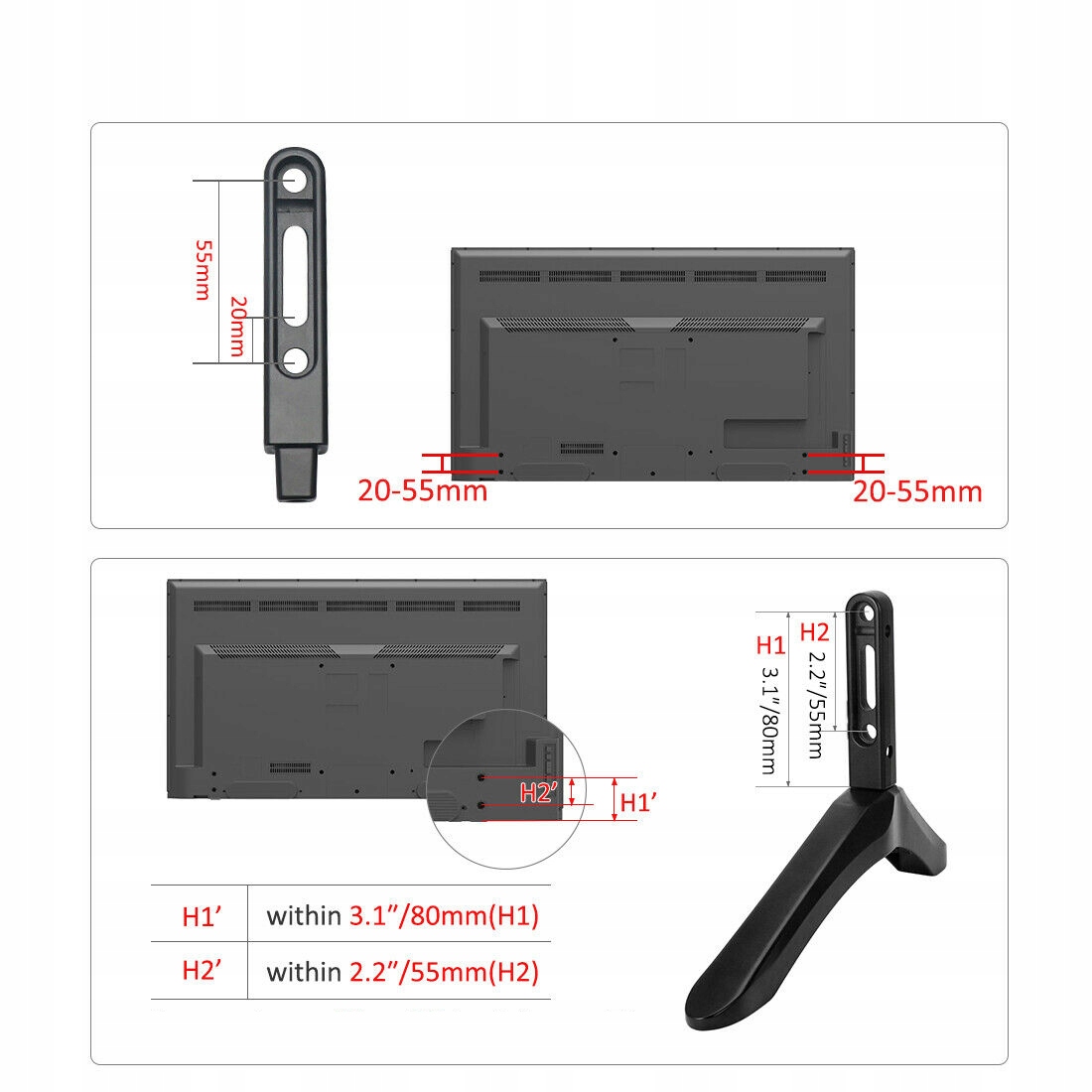 ✅ Кронштейн можно установить двумя способами: на внутреннюю и внешнюю опору телевизора. При покупке подставки проверьте, подходит ли телевизор. Крепежные отверстия на задней панели находятся в нижней части телевизора. Измерьте расстояние между отверстиями. Держатель подходит для телевизоров любой марки с расстоянием между монтажными отверстиями 20–55 мм и весом 45 кг.
