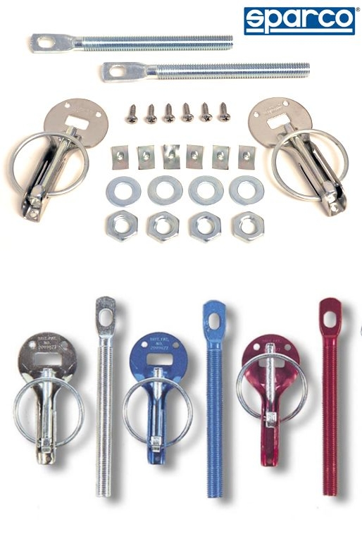 Оригинальные штифты капота Sparco, изготовленные из прочного алюминиевого сплава. Застежки просты в установке, доступны в трех цветах - серебристый, синий и красный.На наших аукционах также представлены пружинные застежки для крепления на дверь багажника.