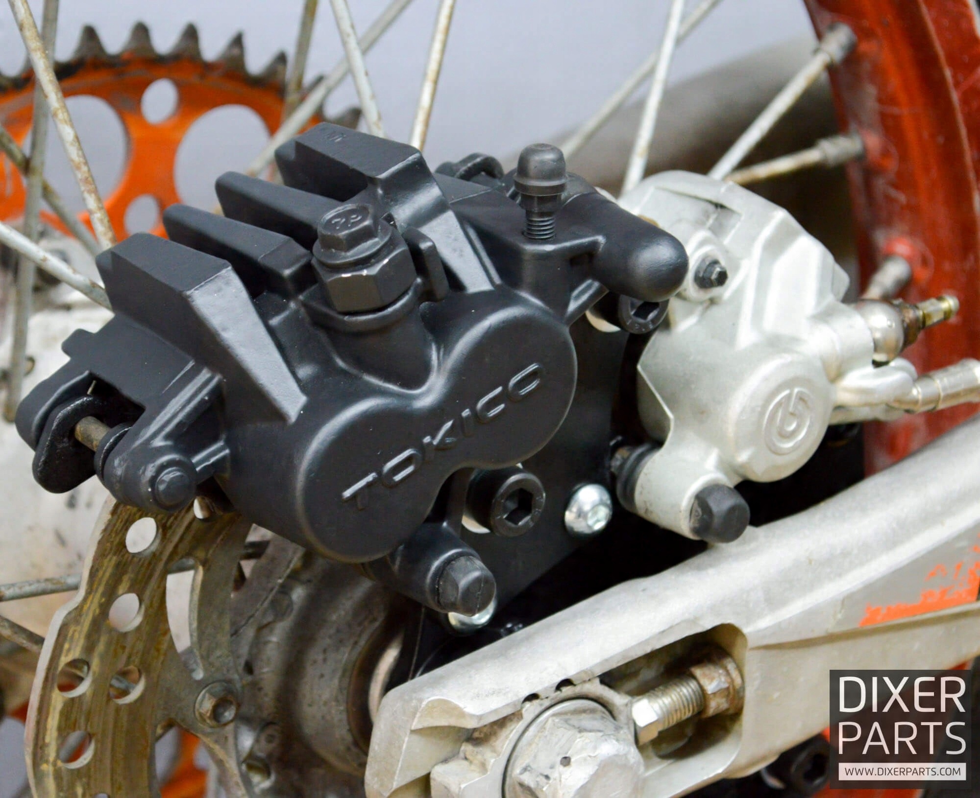 Правый передний двухпоршневой плавающий суппорт Tokico, например, от Suzuki SV 650 (1999-2008 гг.), установлен в верхнем положении.