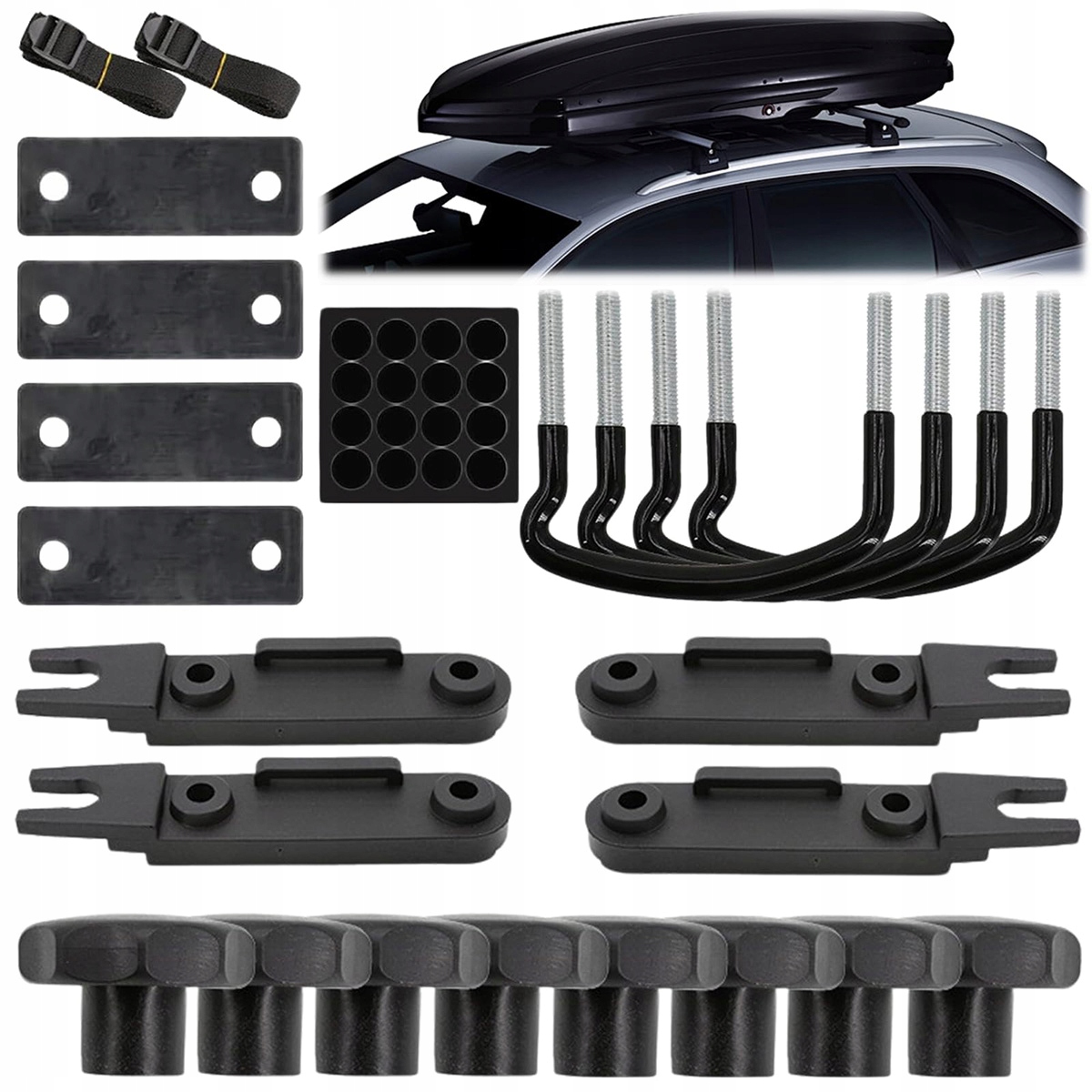 2. Изобилие: это богатый набор аксессуаров для установки бокса на крышу, в том числе 4 металлических зажима с U-образными болтами, 4 пластиковые опорные пластины, 4 резиновые прокладки, 8 сверхпрочных контргаек, 2 бандажа и 1 комплект наклеек для герметизации отверстий, чего достаточно для удовлетворения ваших долгосрочных потребностей.