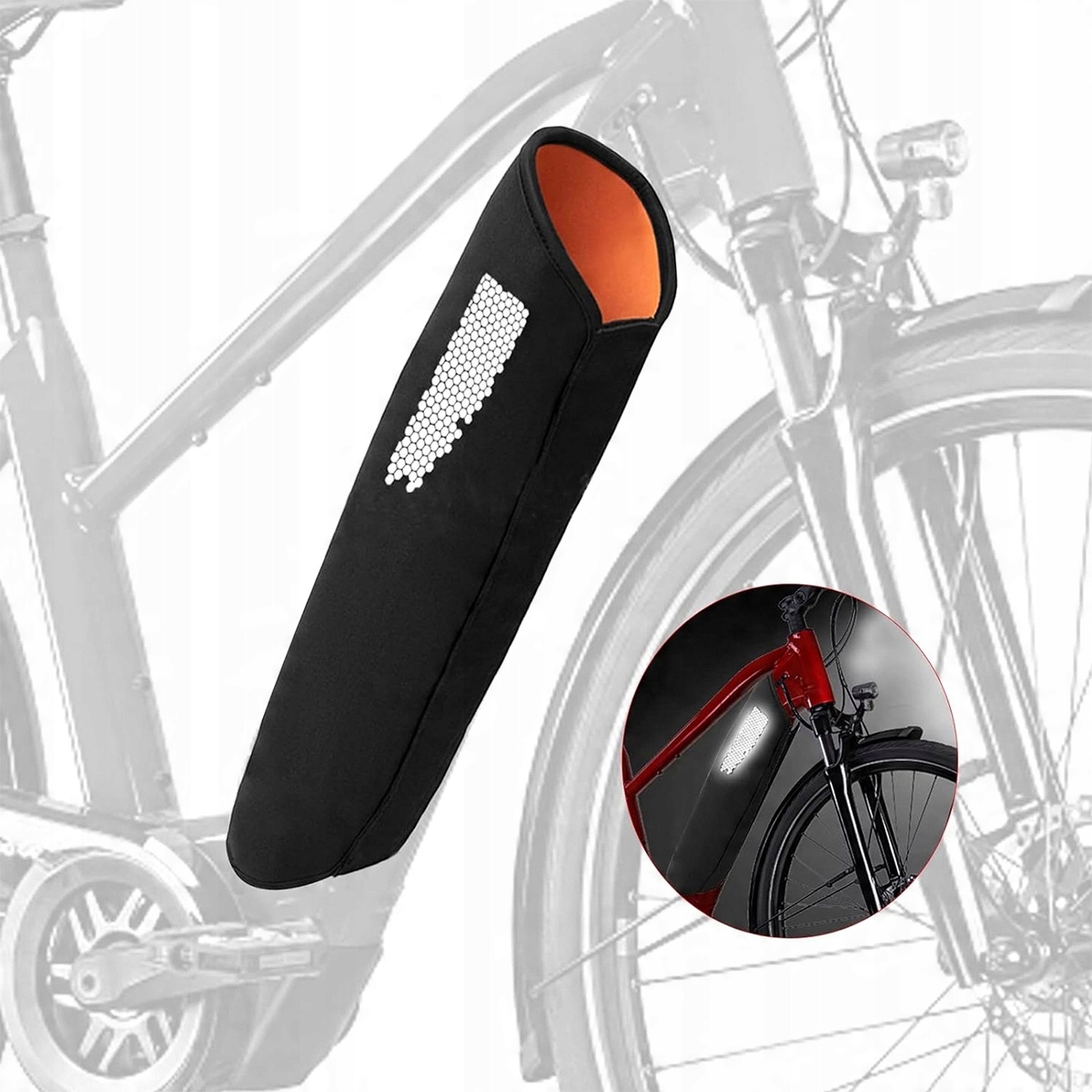 Длина защиты велосипедного аккумулятора составляет ок. 52,5 см (что позволяет почти полностью закрыть батарейный отсек), а общая ширина составляет ок. 42 см, широкая липучка (около 13 см). Батарейный отсек подходит для рамок диаметром от 30 см до 41 см и подходит для рамных батарей всех распространенных марок (включая батареи Bosch 625). В целях безопасности перед зарядкой аккумулятора снимите защитную крышку с двигателя электровелосипеда.