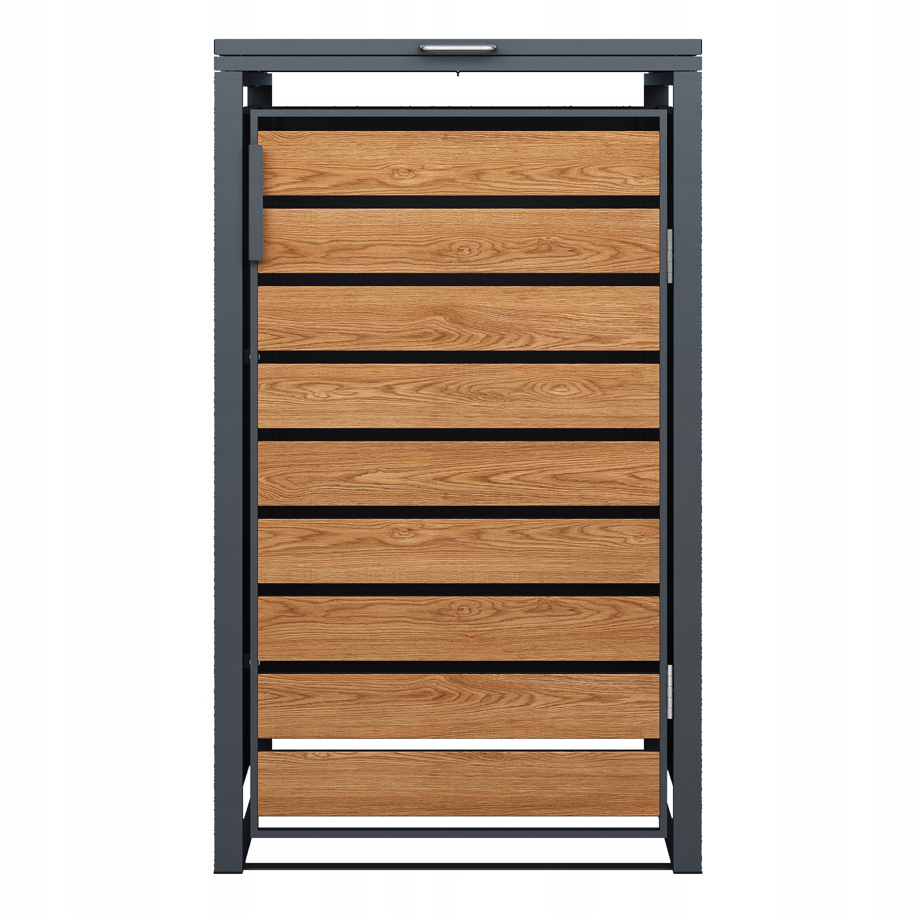 Цвет: антрацит, трансфер дерева Технические данные: Крышка рассчитана на корзину объемом 1 240 литров. Рост: 116 см Ширина: 68 см Глубина: 80 см Двойные двери оборудованы ручками. Соединительные элементы, петли, затворы Конструкция имеет входную дверь с контейнером и подъемную створку с фиксатором высоты. Материалы устойчивы к изменяющимся погодным условиям, долговечны и не требуют ухода. Максимальные размеры мусорных контейнеров: ширина: 00, глубина: 00, высота: 00. Современный, эстетичный внешний вид застройки. Легкая, но прочная конструкция позволяет перемещать конструкцию двум людям. Конструкция имеет открывающуюся верхнюю крышку, обеспечивающую легкий доступ к контейнерам для мусора. К верхней створке прикреплена правильно подобранная газовая пружина, которая помогает открывать и останавливать ее под оптимальным углом. Для защиты конструкции при закрытии люка используются специальные амортизирующие бамперы.
