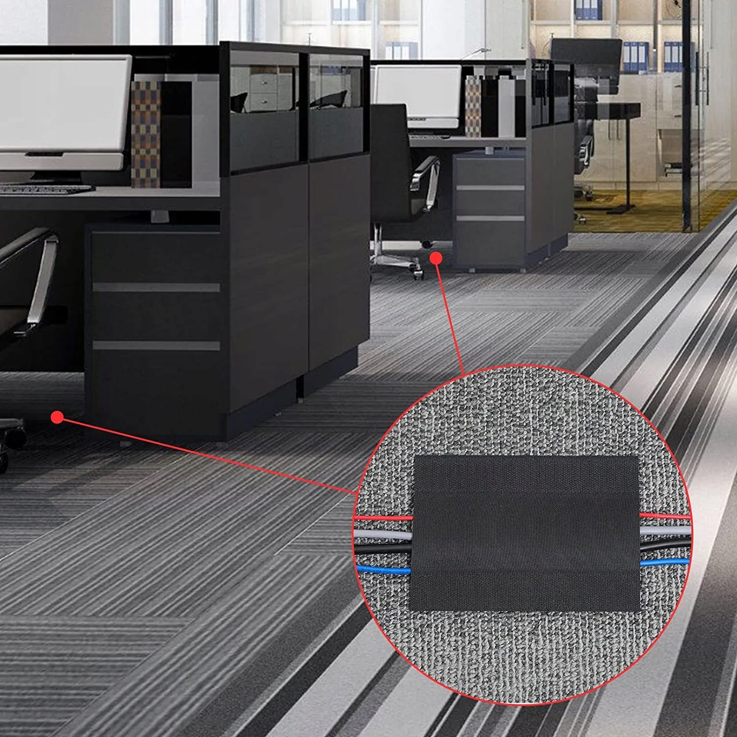 Идеально подходит для организации оптоволокна, проводов и пучков кабелей для подключения электроники устройства в офисных помещениях, открытых пространствах и везде, где пол покрыт ковролином или ковровым покрытием.