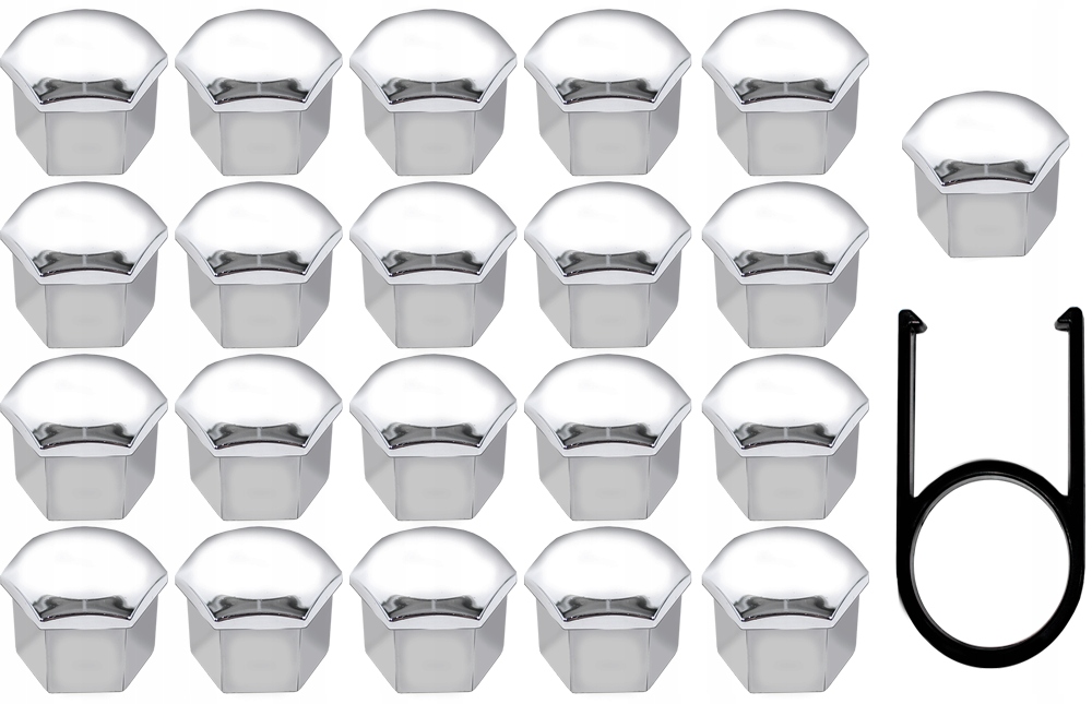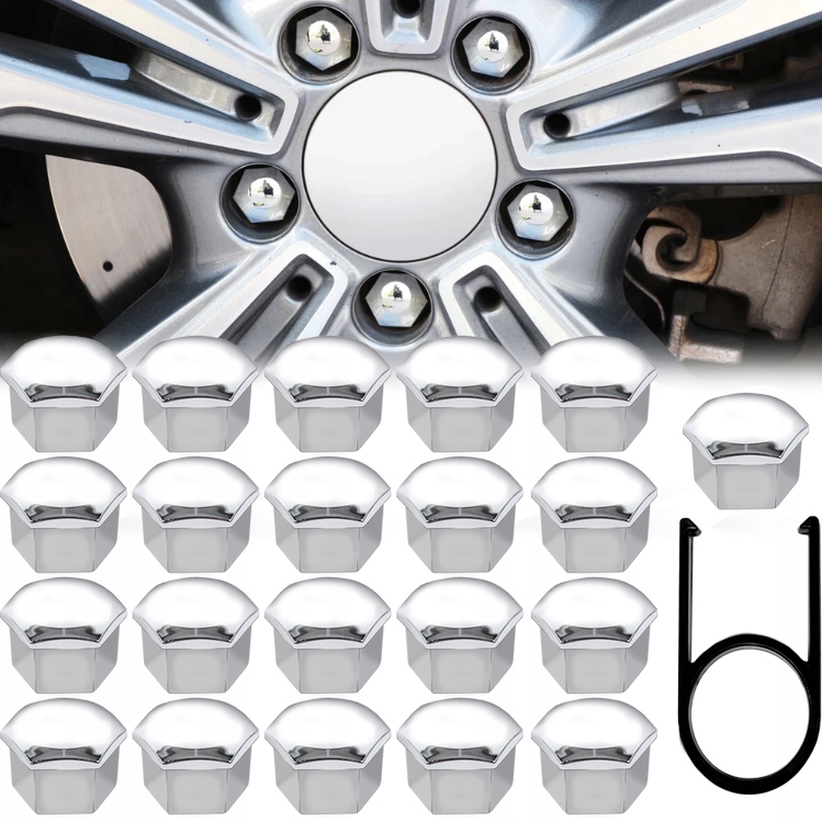 Набор из 21 штуки хромированных крышек для винтов с ключом на 17 мм и ключом для разборки.