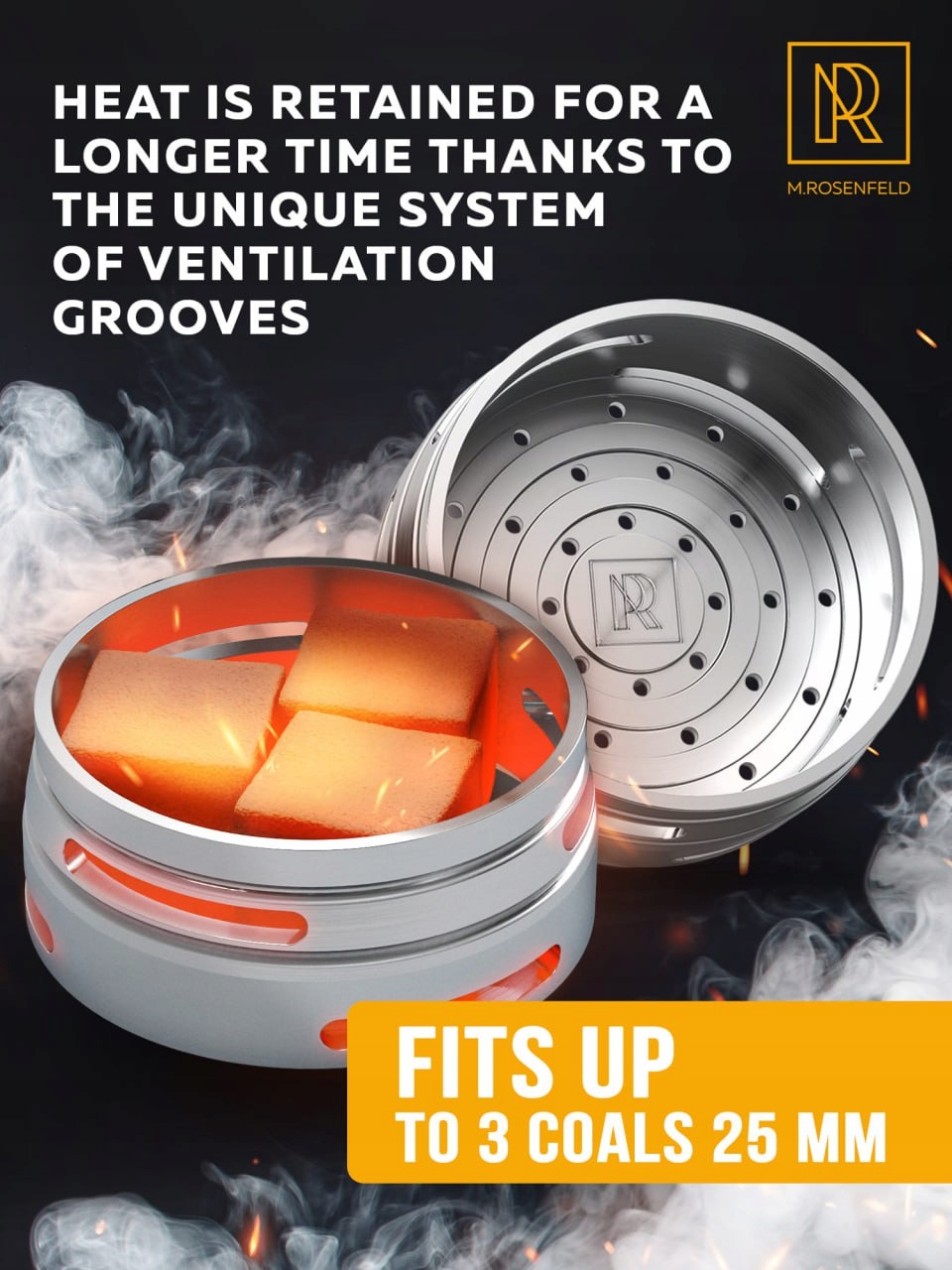 Камера легко вмещает три кубика по 25-26 мм, благодаря чему табак/патока нагревается равномерно, а сеанс получается дольше и приятнее - без постоянного переворачивания угля. Высококлассный алюминиевый блок (без токсичных покрытий) и точная лазерная обработка гарантируют долговечность и идеальную подгонку элементов. HMD подходит к большинству популярных чаш (керамических, глиняных, каменных и силиконовых), поэтому легко впишется в ваш набор.