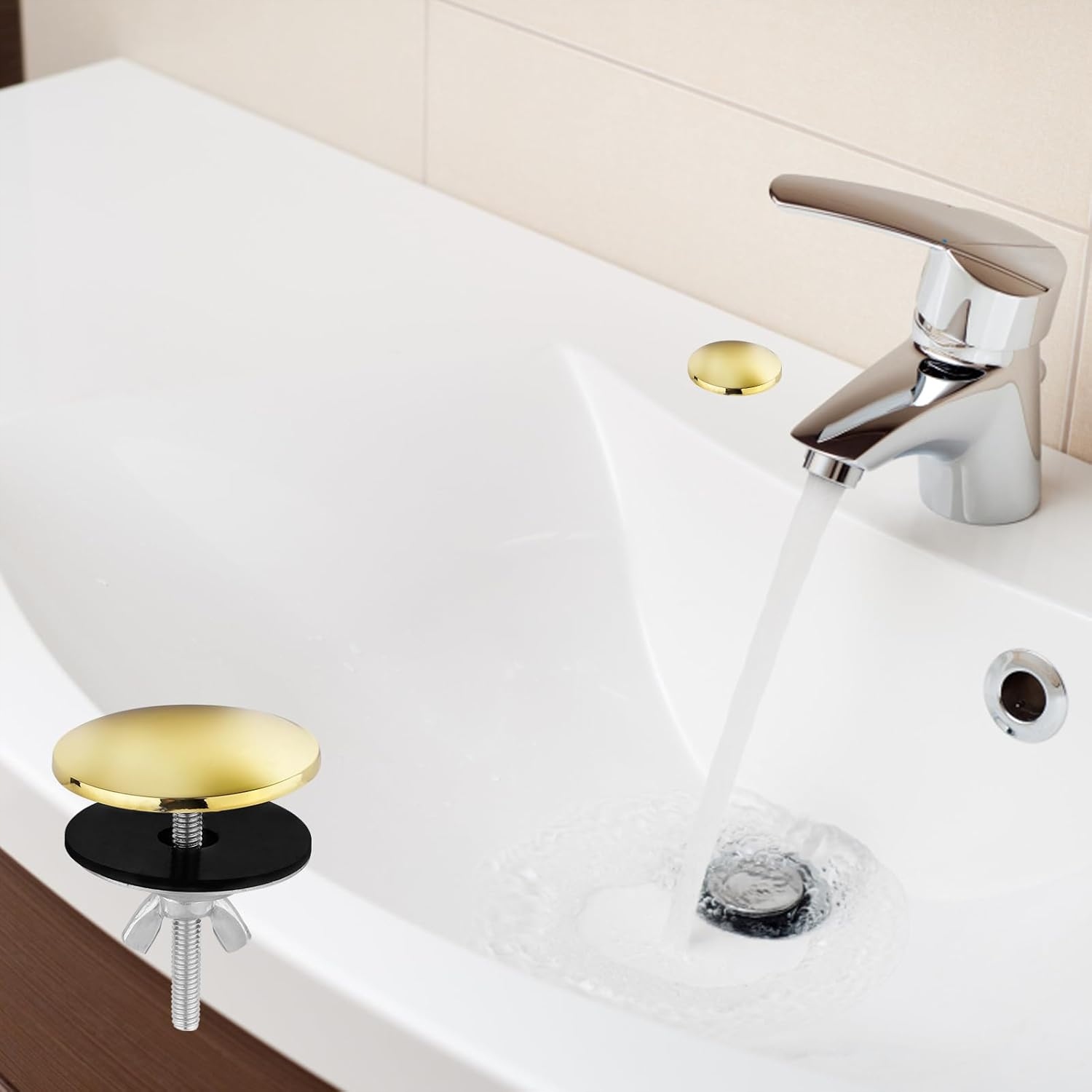 Элегантный и функциональный крышка раковины Boxob в золоте - это быстрое и эстетическое решение для неиспользованных отверстий в раковине.