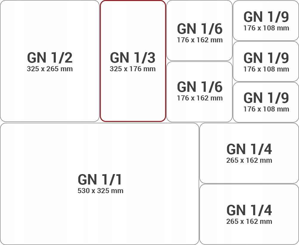 Размеры емкостей соответствуют стандарту GASTRO NORM PN-EN 631-1:1996, что означает, что их размеры точно указаны: