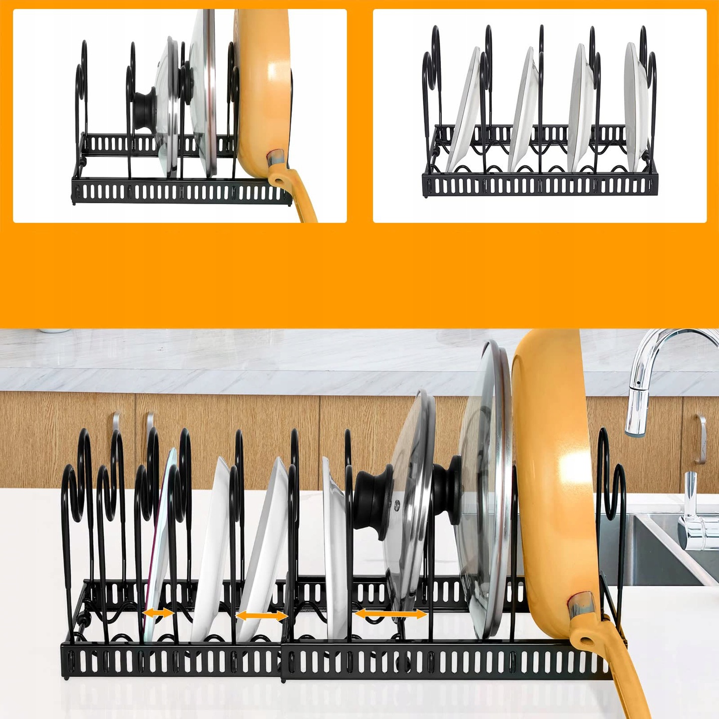 Наш расширяемый органайзер для сковородок легко собрать. Собрать его можно за считанные минуты без инструментов. Его можно использовать в качестве отдельного регулируемого держателя крышки кастрюли, а также разделить на два независимых органайзера для кастрюль для отдельного использования, чтобы лучше адаптироваться к кухонному пространству.