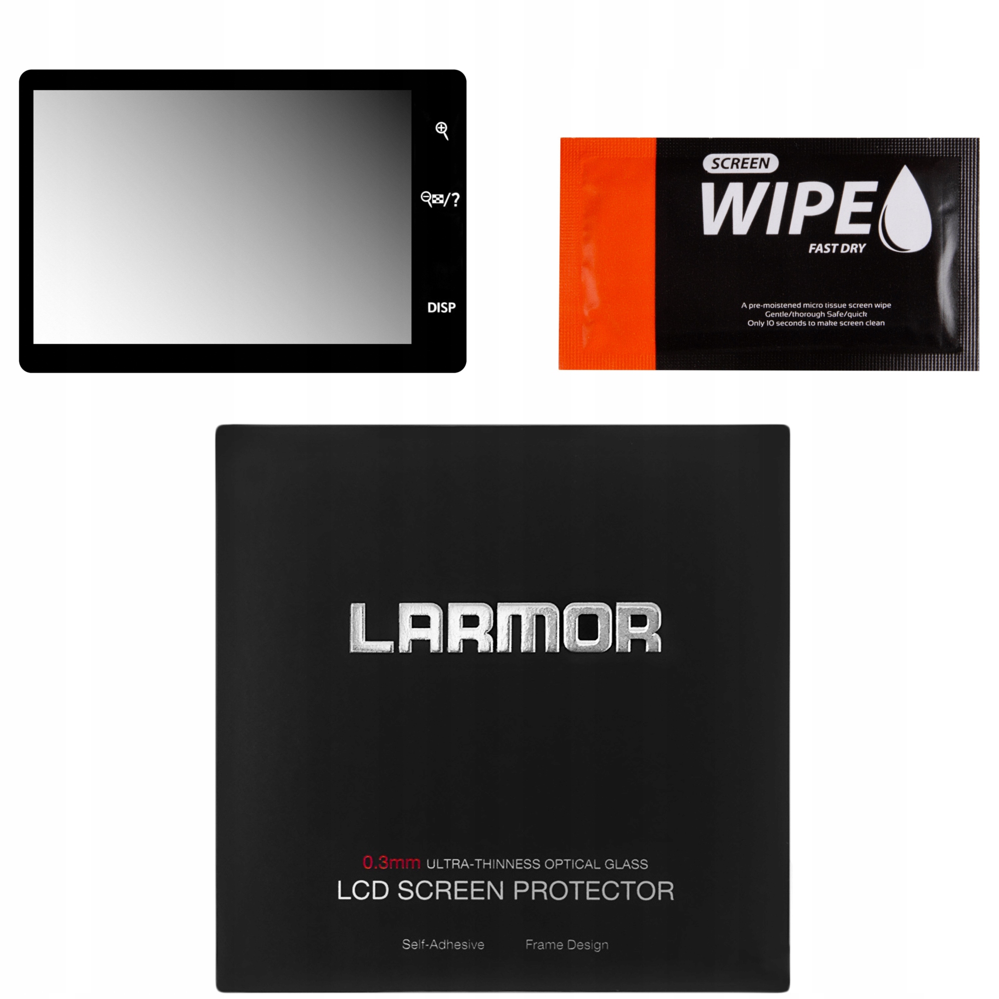 В комплект также входит влажная тряпка для очистки ЖК-экрана перед установкой.
