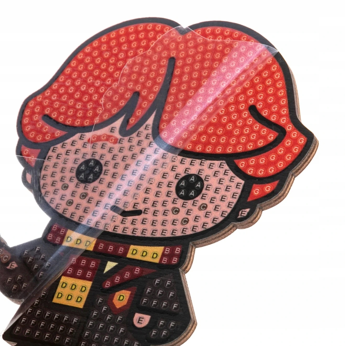 В комплект входит изображение персонажа с самоклеющимся шаблоном и комплектные аксессуары для приклеивания камней (ручка для нанесения камней, поднос, воск и мешочки с кристаллами). В комплект также входит деревянная основа.