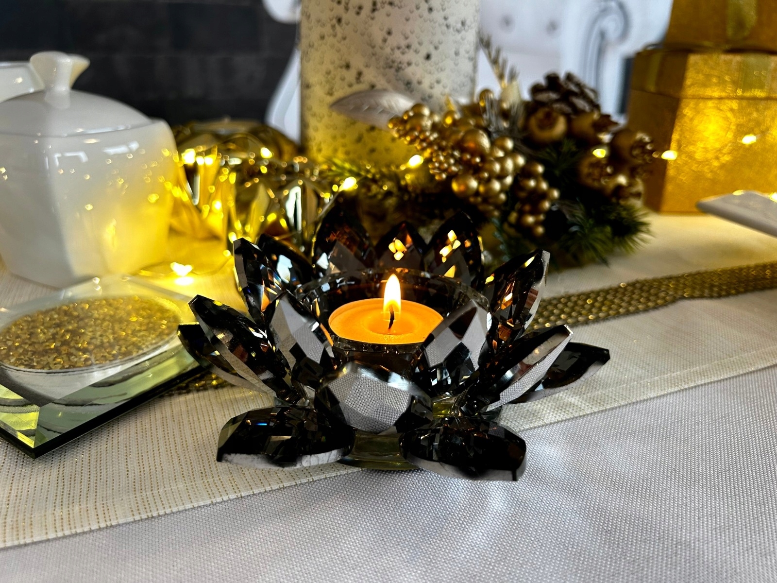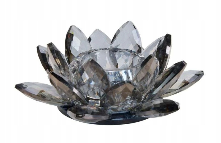 Декоративный подсвечник в форме лотоса изготовлен из толстого стекла высочайшего качества черного оттенка.