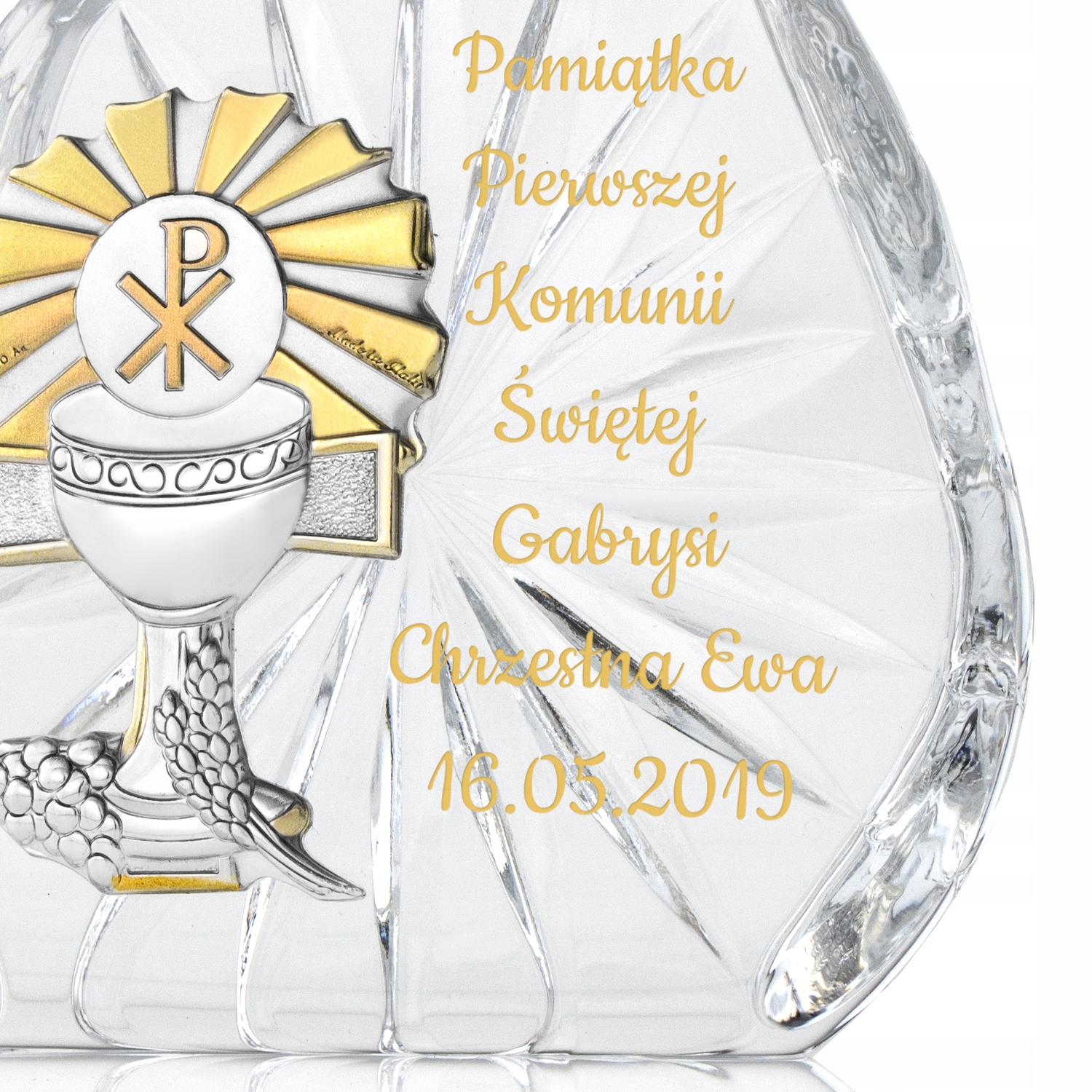 Хрустальный камень с эмблемой чаши и позолоченной гравировкой-посвящением — прекрасный подарок ребенку по случаю Первое Причастие. Это уникальный сувенир ручной работы, выполненный с вниманием к деталям.