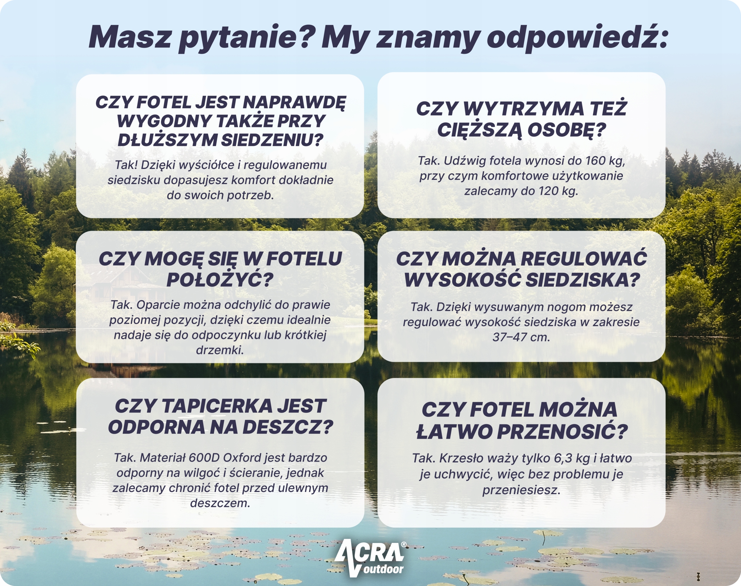 Просматривая «Кресло ACRA Outdoor Comfort с регулируемой жесткостью сиденья», вы можете быть уверены, что данный товар из каталога «Рыболовные стулья» будет доставлен из Польши и проверен на целостность. В цене товара, указанной на сайте, учтена доставка из Польши. Внимание!!! Товары для Евросоюза, согласно законодательству стран Евросоюза, могут отличаться упаковкой или наполнением.