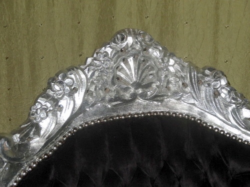 Предмет аукциона – кресло в стиле барокко. Деревянная конструкция, как и подобает этому стилю, богато украшена резьбой из серебра. Обивка выполнена из плюша - черного цвета, спинка простегана и эстетично отделана булавкой.