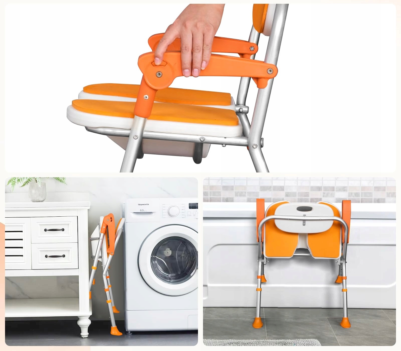 Складная конструкция: этот складной табурет для душа имеет практичную складную конструкцию, которую можно сложить одним щелчком мыши и убрать, чтобы сэкономить место. Идеально подходит для небольших ванных комнат и ограниченного пространства. Оснащен держателем для съемной душевой насадки, подходит для пожилых людей и людей с ограниченной подвижностью.