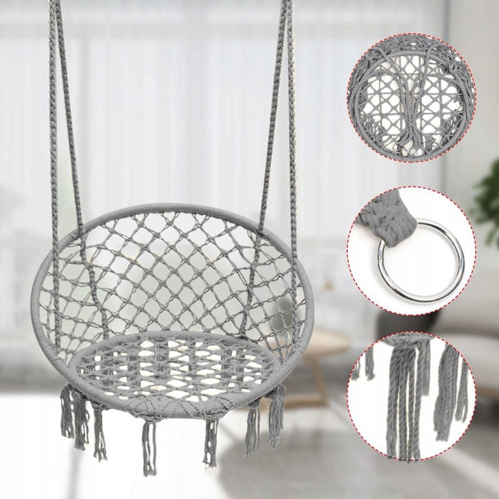 Натуральный материал обеспечивает надлежащую вентиляцию, что позволяет сохранять комфорт использования кресла даже в жаркие дни. Очень большим преимуществом представленной модели является прочный каркас из листового металла, обтянутый веревкой, благодаря чему каждый элемент надежно закреплен и качелями могут пользоваться как взрослые, так и дети.