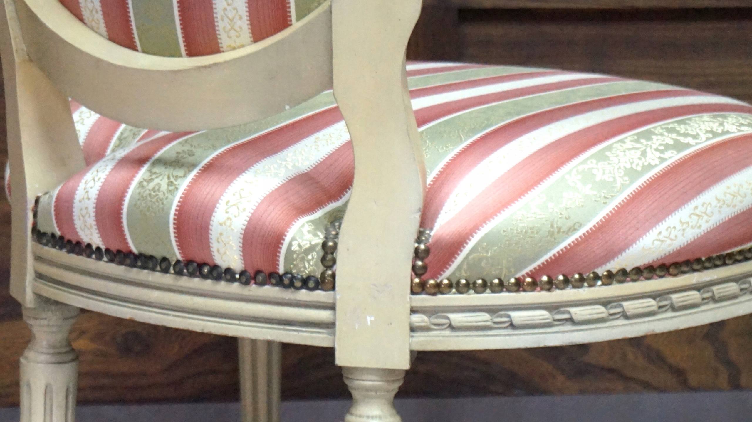 Обивка жаккардовая с полосками бежевого, карминового цвета с блестящими полосками цвета хаки