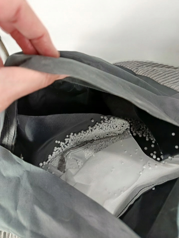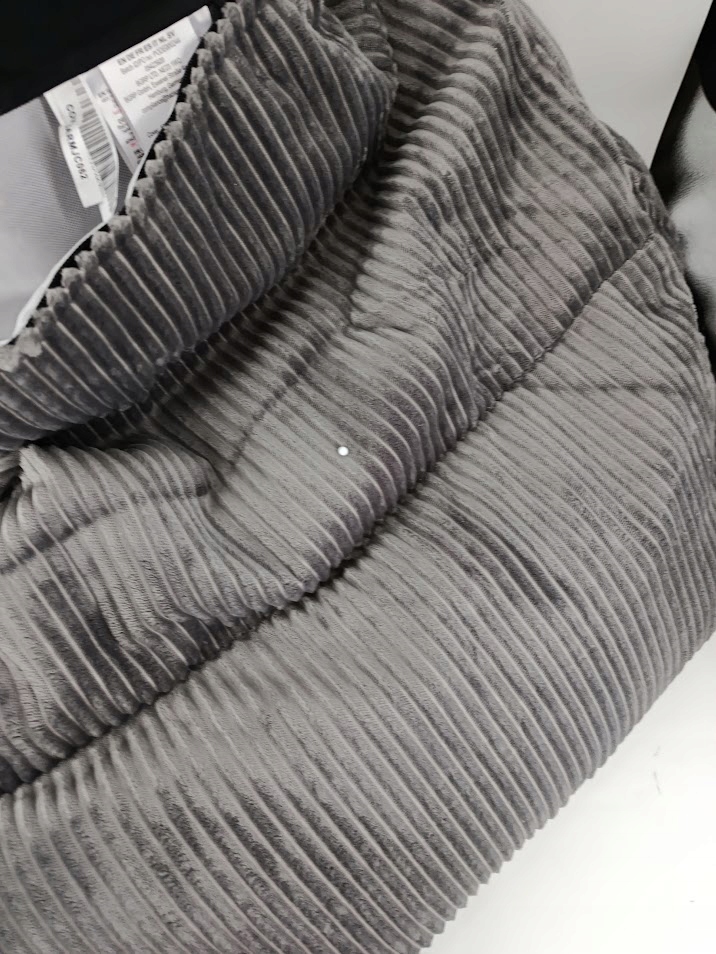 В материале видна дырка, из-за которой выпала часть наполнителя - неизвестно сколько, но большая часть выпала.