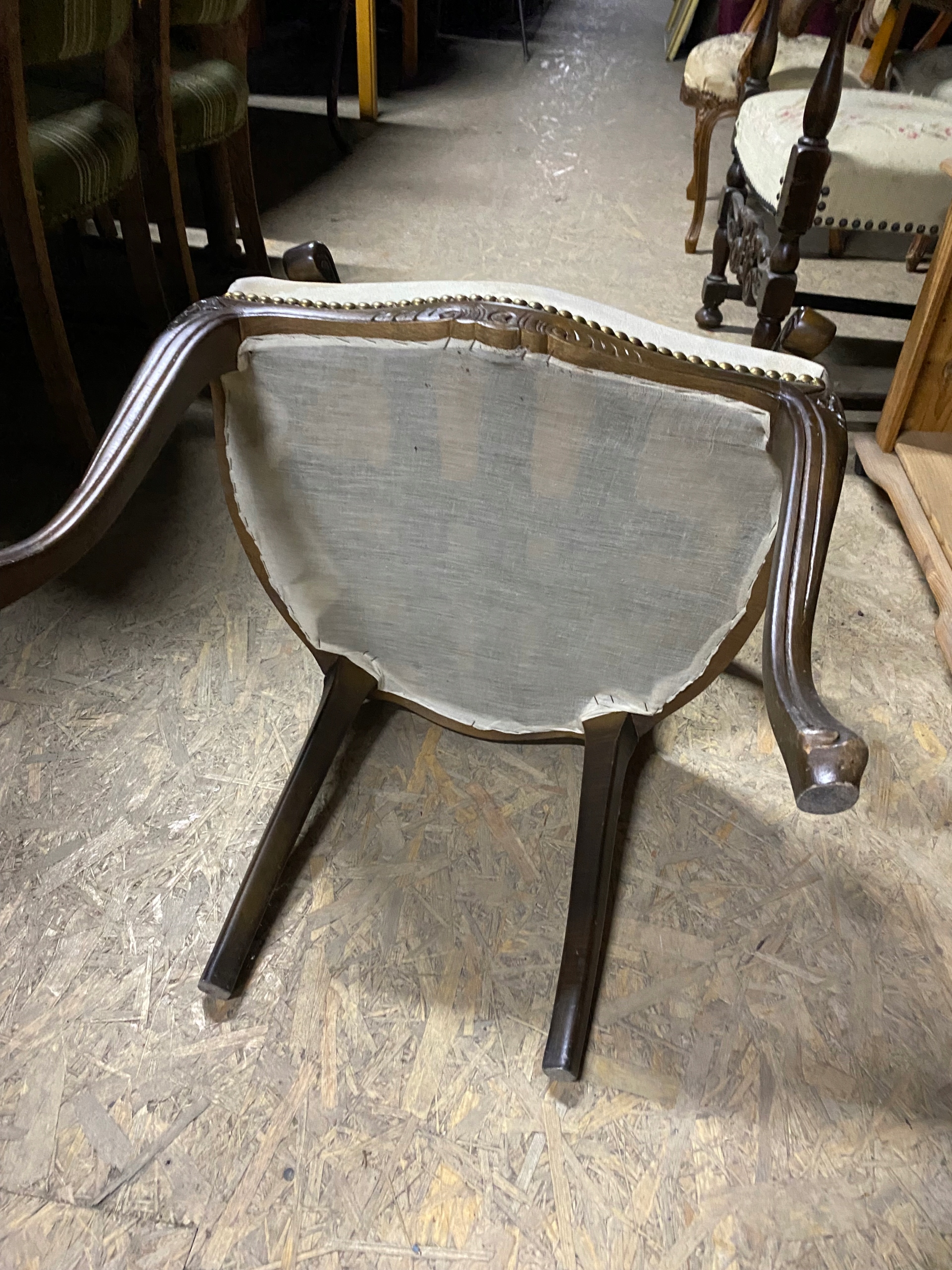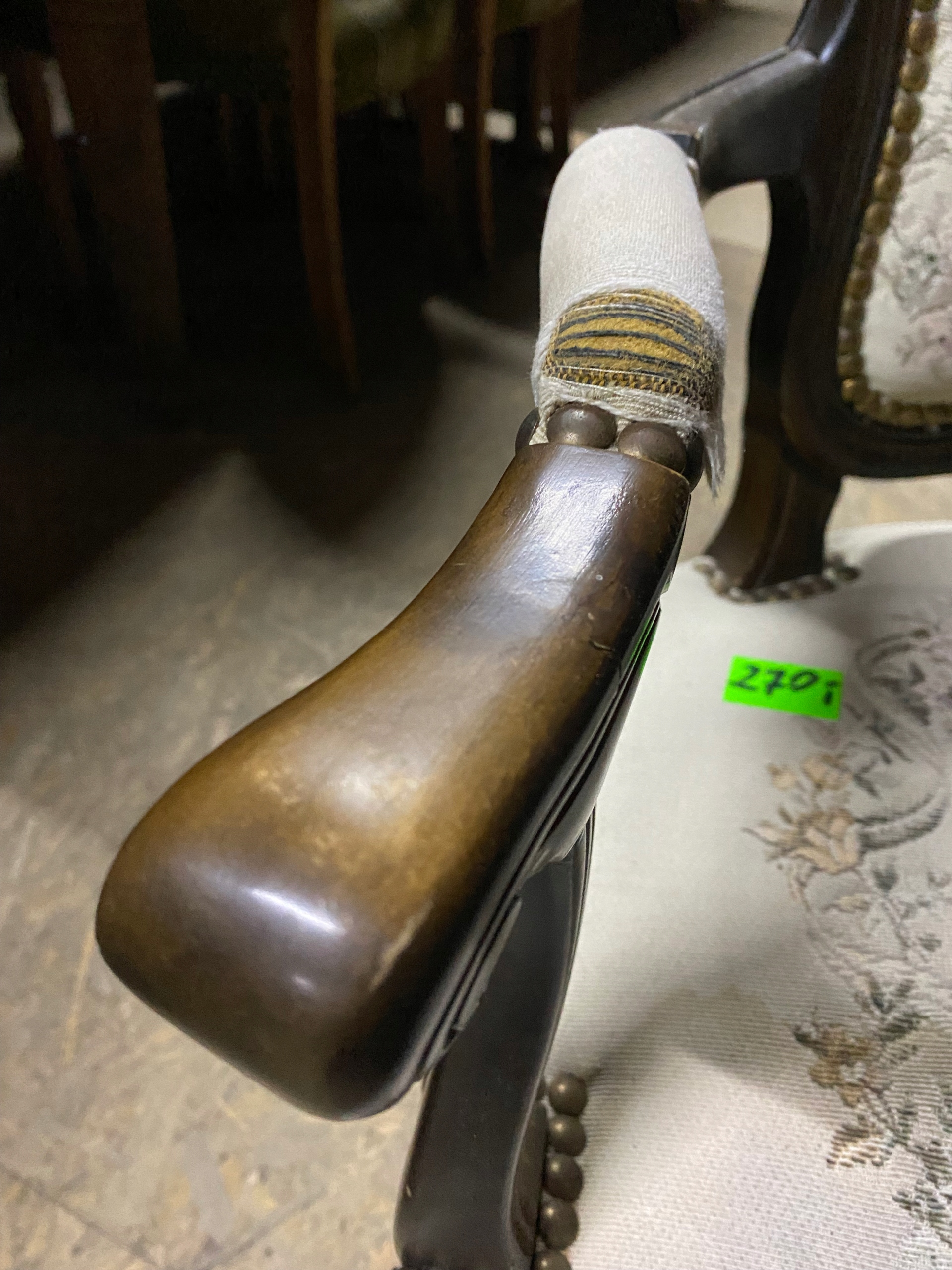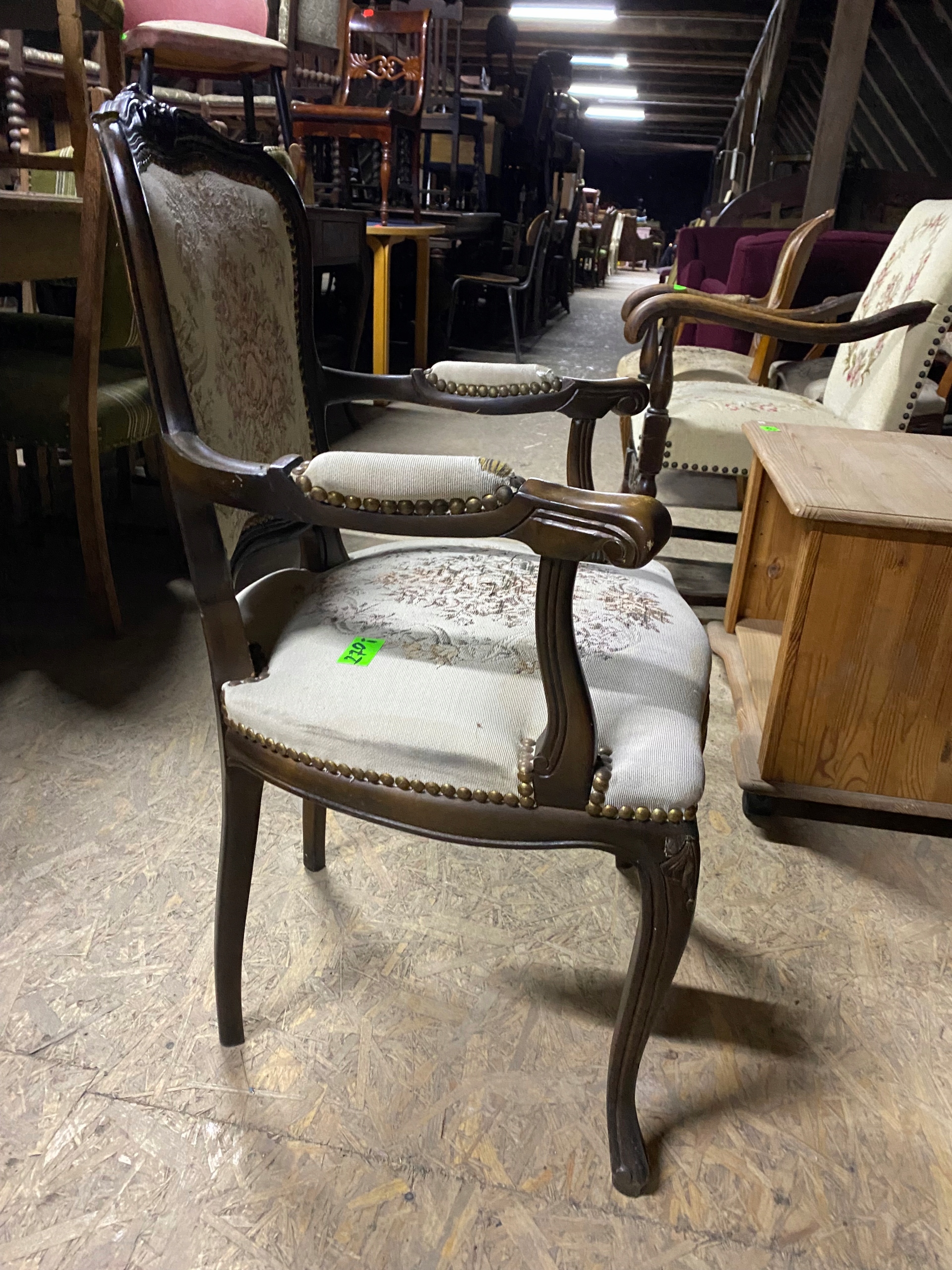 Кресло Людовика с гобеленовыми цветами. Под ремонт или использование как есть. Конструктивно хорошо. Как видите, у него уже есть дыры в подлокотниках и заляпанное и забитое сиденье. Дерево кое-где изношено. Есть сколы, потертости и царапины, это видно на фотографиях.